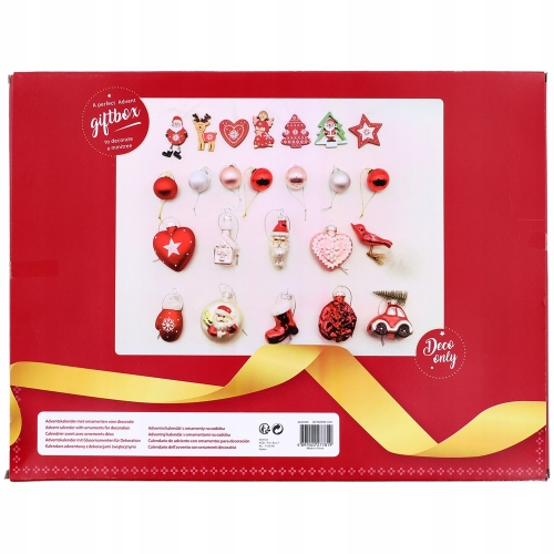 Kalendoriuje yra 24 atskiri langeliai, o už jų – skirtingi, itin mieli žaisliukai: sniego seniukai, mini širdelės, žvaigždutės, automobiliai, paukšteliai, angeliukai, eglutės, mažos figūrėlės ir kiti Kalėdų simboliai. Ši raudonoji versija ypač spindi šventiškumu – žaisliukai raudonų, baltų, aukso ir žiemiškų tonų, kurie sukuria klasikinę Kalėdų nuotaiką.