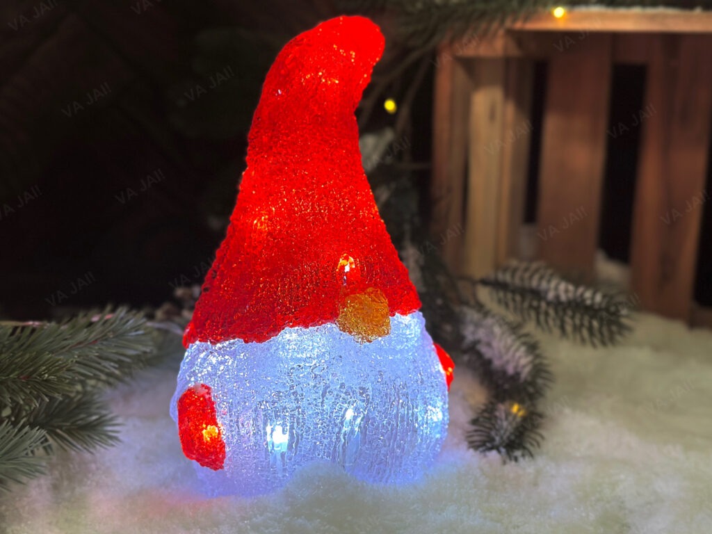 Pagaminta iš skaidraus akrilo, dekoracija pasižymi ypatingu šviesos pralaidumu. Tai leidžia LED lemputėms sklisti per visą figūrą, suteikiant jai gyvybės ir natūralaus spindesio. Ryški raudona kepurė kontrastuoja su šaltai balta šviesa, todėl dekoracija iškart patraukia akį ir tampa pagrindiniu šventinės aplinkos akcentu.