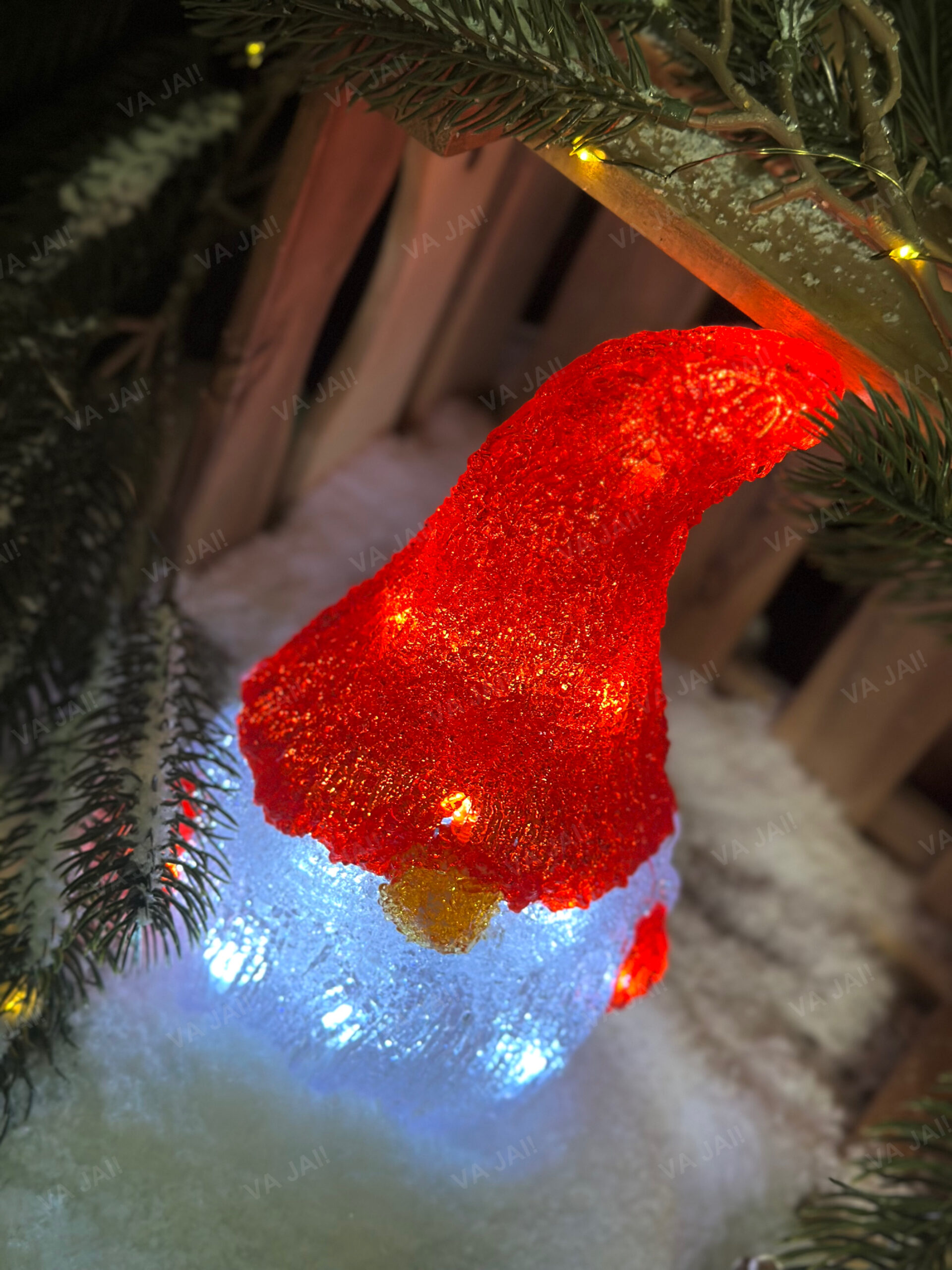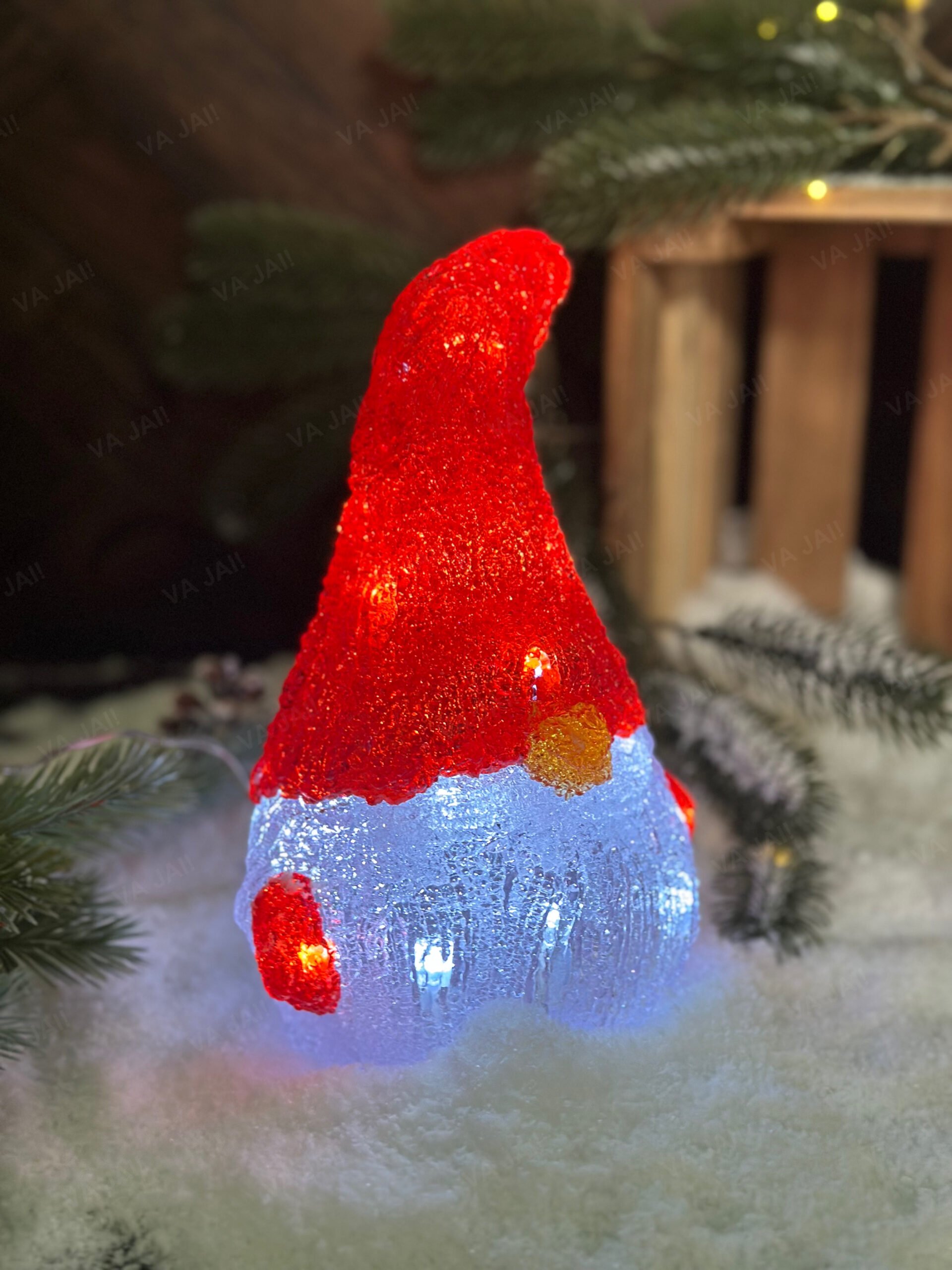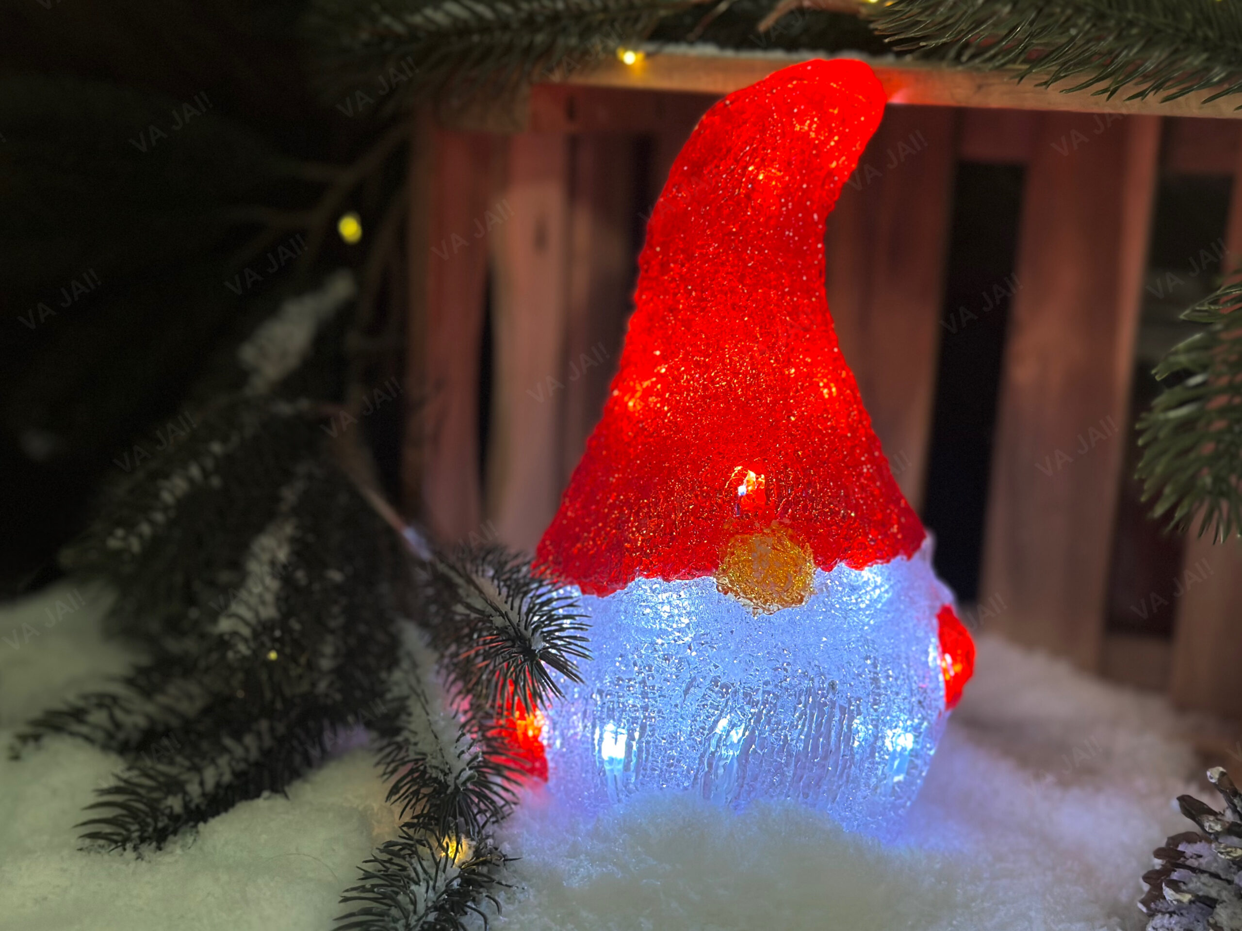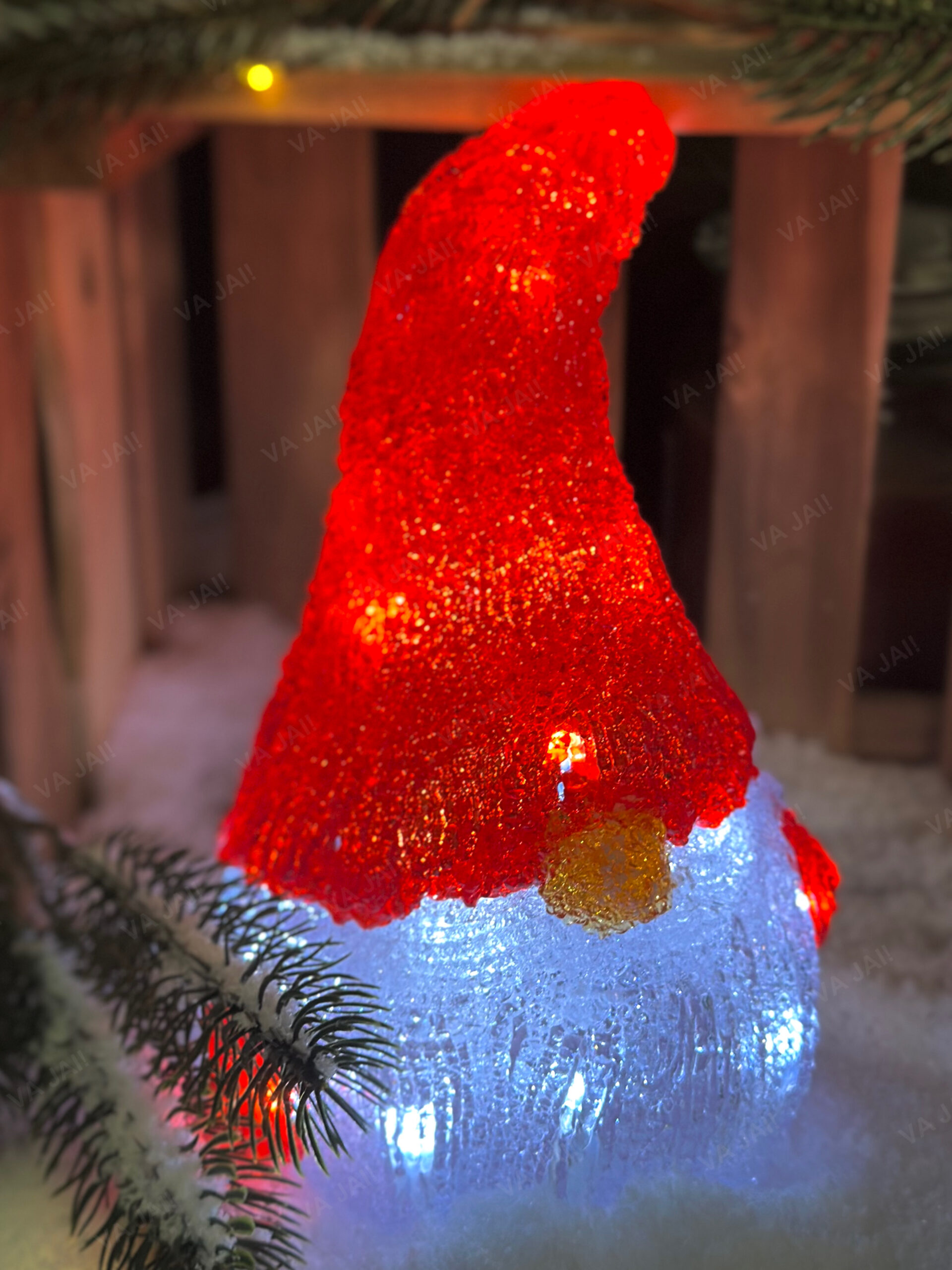 Pagaminta iš skaidraus akrilo, dekoracija pasižymi ypatingu šviesos pralaidumu. Tai leidžia LED lemputėms sklisti per visą figūrą, suteikiant jai gyvybės ir natūralaus spindesio. Ryški raudona kepurė kontrastuoja su šaltai balta šviesa, todėl dekoracija iškart patraukia akį ir tampa pagrindiniu šventinės aplinkos akcentu.