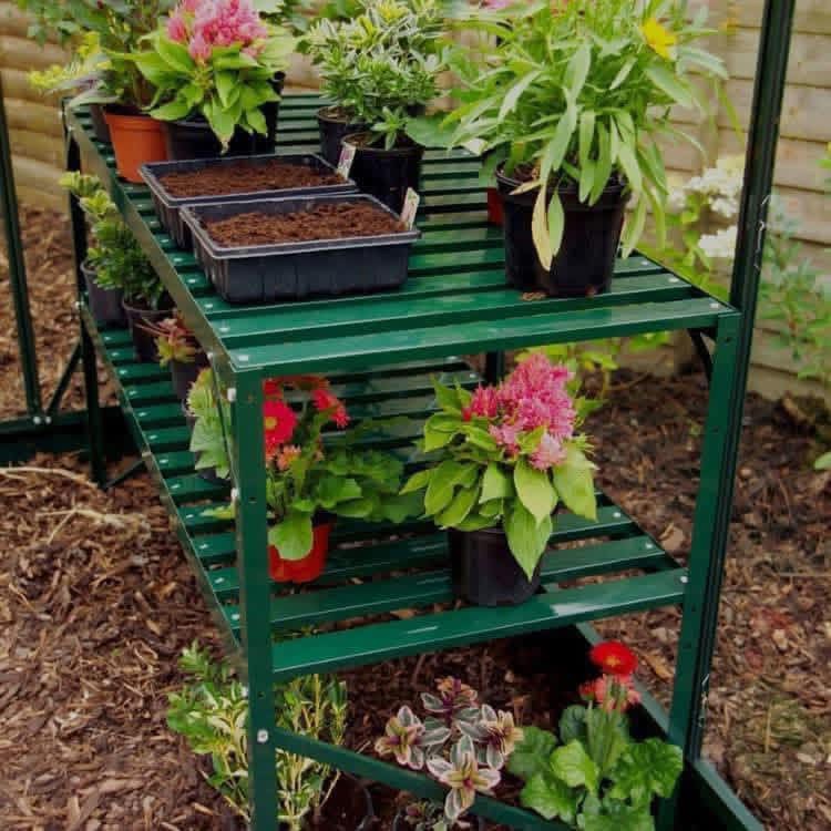 Dvi lentynos suteikia galimybę patogiai organizuoti augalus pagal jų aukštį ar poreikius. Viršutinėje lentynoje galima laikyti šviesą mėgstančius sodinukus ar žydinčius augalus, o apatinėje – daigyklas, papildomus vazonus ar sodo reikmenis. Tokia organizacija padeda ne tik taupyti vietą, bet ir palaikyti tvarką.