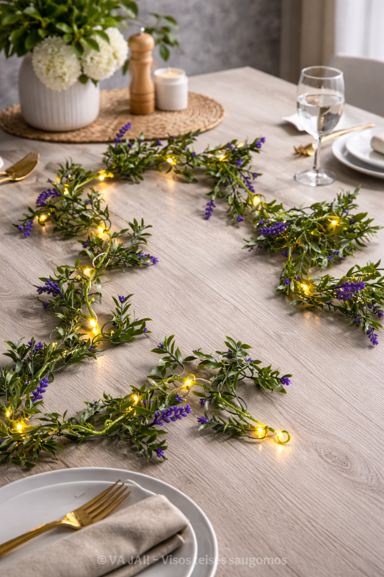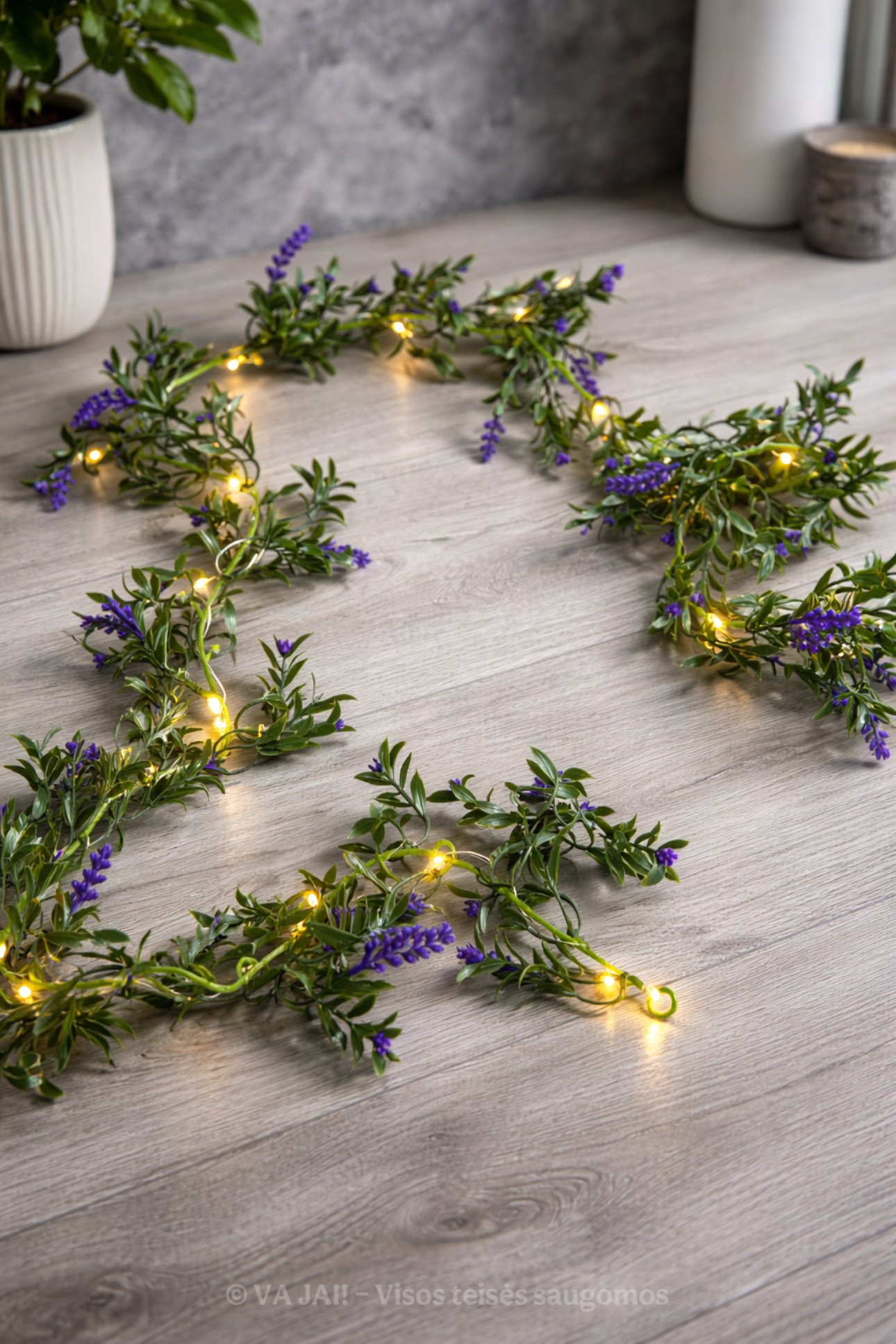 Girlianda dekoruota dirbtinėmis levandomis, kurios pasižymi labai realistiška išvaizda. Smulkūs violetiniai žiedeliai ir sodrios žalios spalvos lapeliai kruopščiai išdėstyti per visą 160 cm ilgį, todėl dekoracija atrodo pilna, proporcinga ir estetiškai subalansuota. Iš pirmo žvilgsnio sunku atskirti, kad tai dirbtinis augalas – būtent tai ir sukuria natūralumo įspūdį.