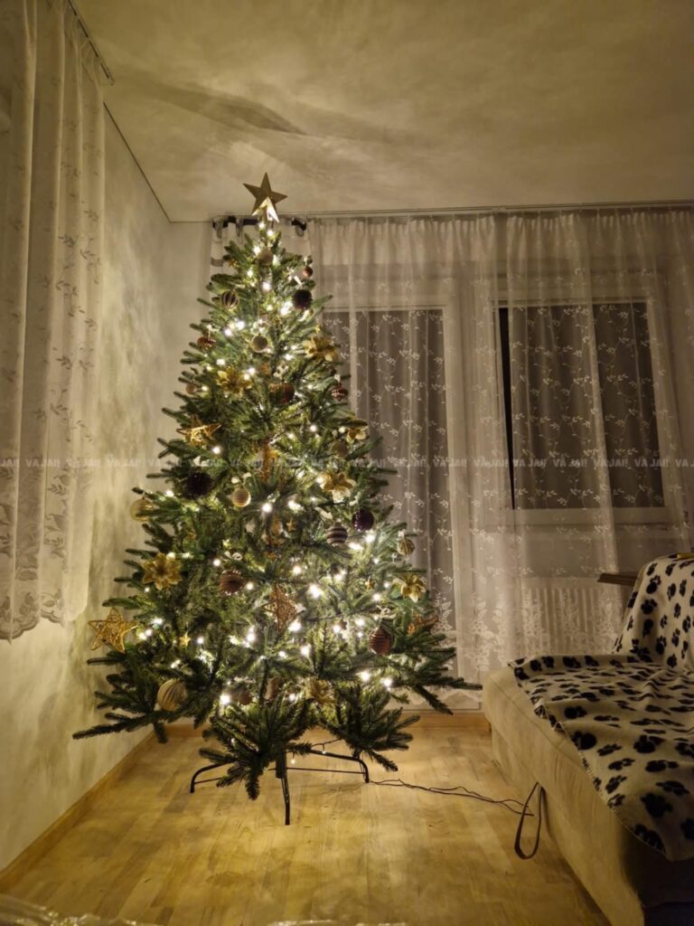 Ši šviesa nėra per ryški – ji subtiliai apgaubia eglę šiltu švytėjimu, primenančiu žvakių liepsnų šviesą. Tai idealus fonas ramiems vakarams, kai norisi susisukti į pledą, išgerti karštos kakavos ir pasinerti į Kalėdų stebuklą.