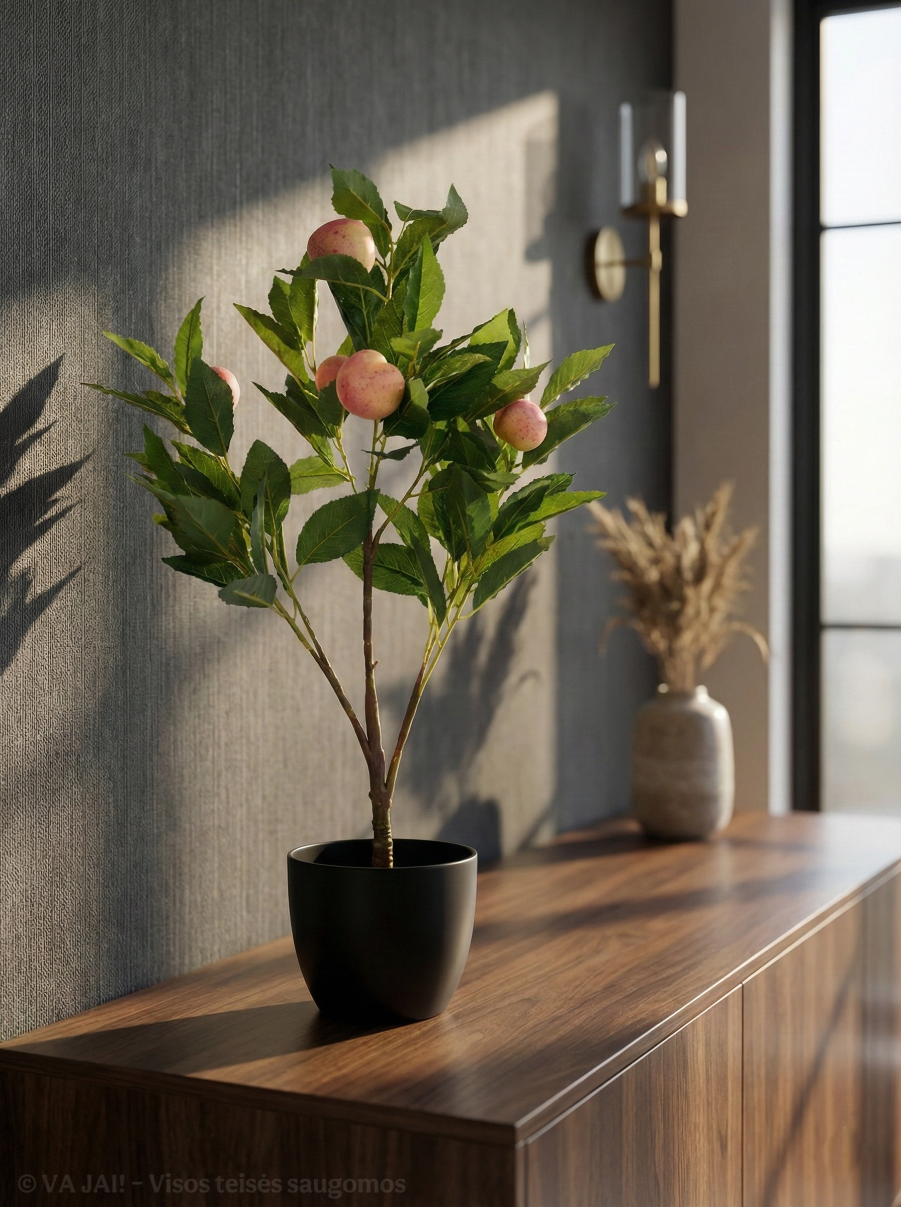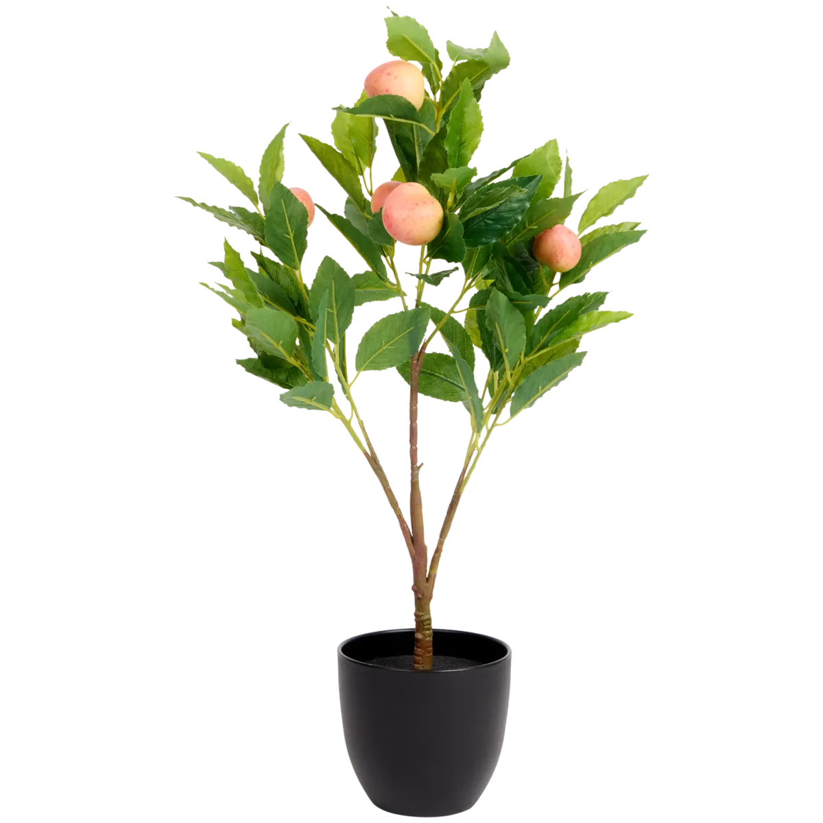 Šis dirbtinis augalas išsiskiria itin reališka išvaizda. Žali, sodrūs lapai su aiškiai matomomis gyslomis atkartoja tikrų augalų struktūrą, o švelniai rausvi persikų vaisiai suteikia dekorui unikalumo. Vaisiai atrodo natūraliai – ne per ryškūs, ne dirbtinai blizgūs, todėl augalas harmoningai įsilieja į aplinką ir neatrodo perkrautas.
