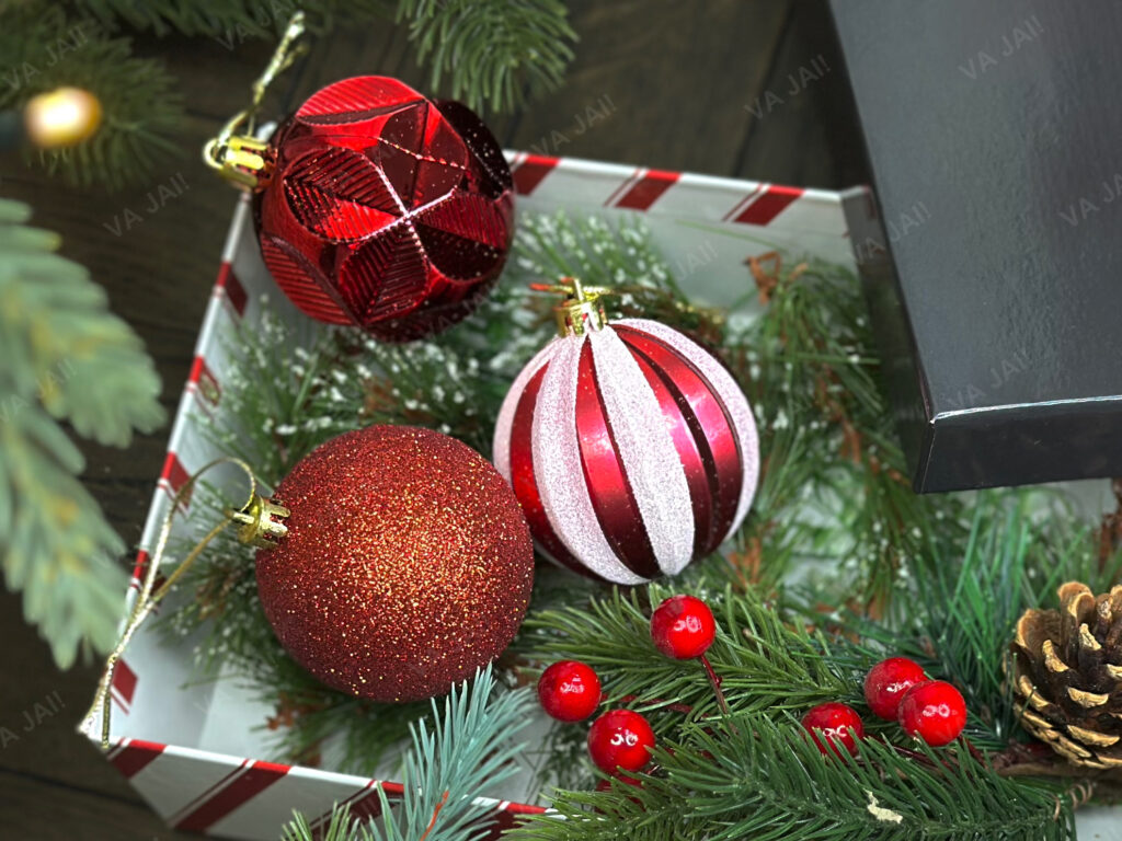 Pirmasis žaisliukas – tai raudonas blizgus ornamentas su geometriniu raštu. Jo paviršius sukuria išraiškingą šviesos žaismą, kuris atrodo tarsi prabangus kristalų mozaikos efektas. Šis žaisliukas tampa pagrindiniu akcentu eglutėje, nes jo raudona spalva simbolizuoja meilę, šilumą ir Kalėdų tradicijas.