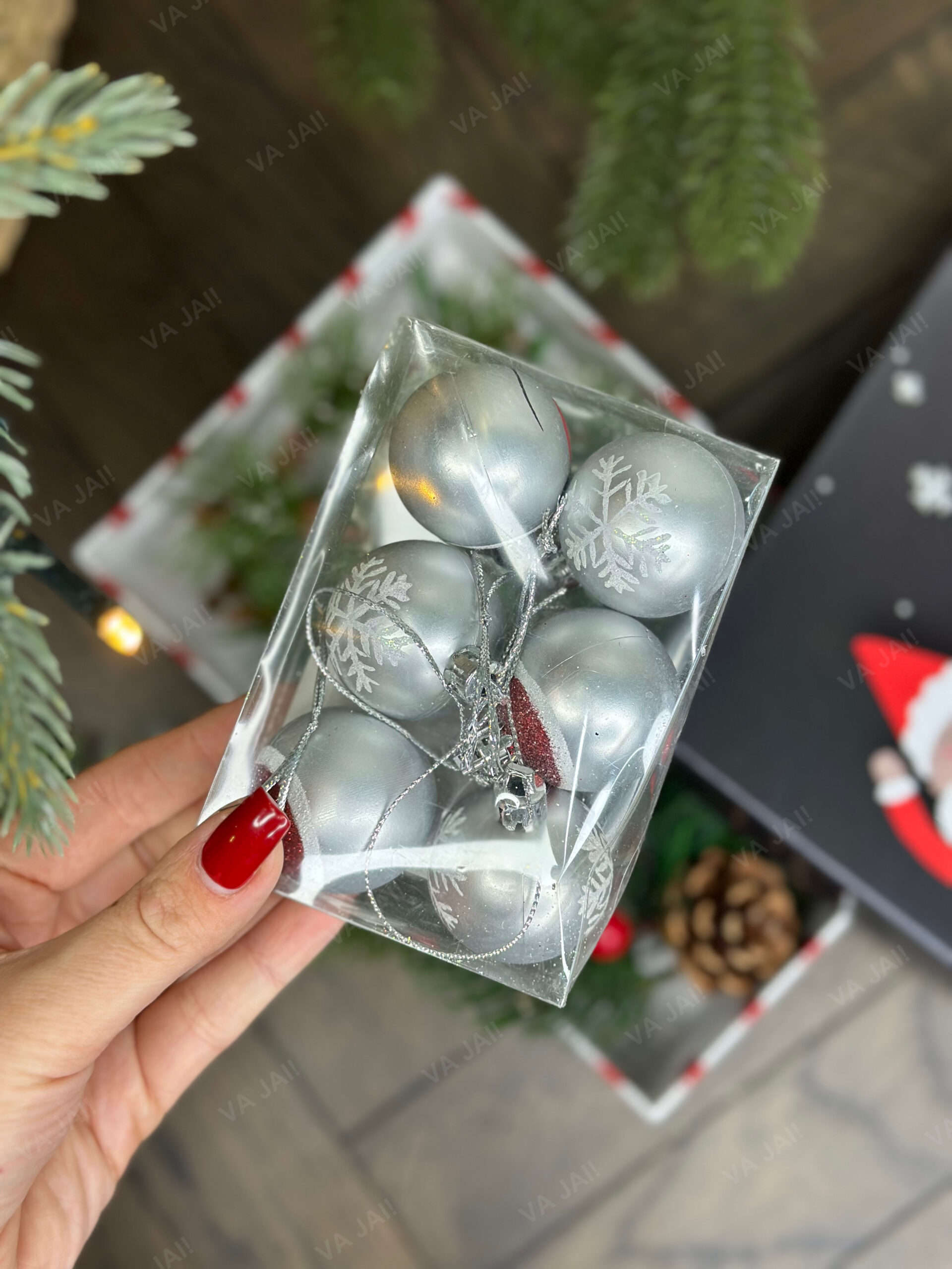 - Dizainas: 3 vnt. sidabriniai su snaigėmis, 3 vnt. su sniego senio veidukais