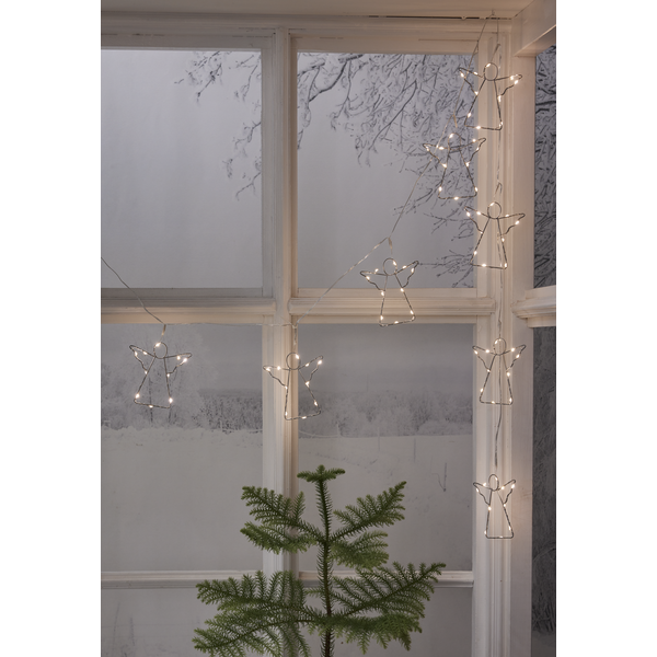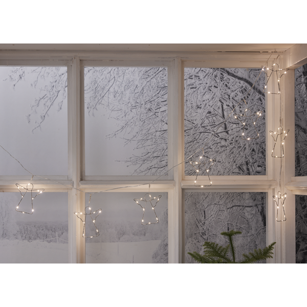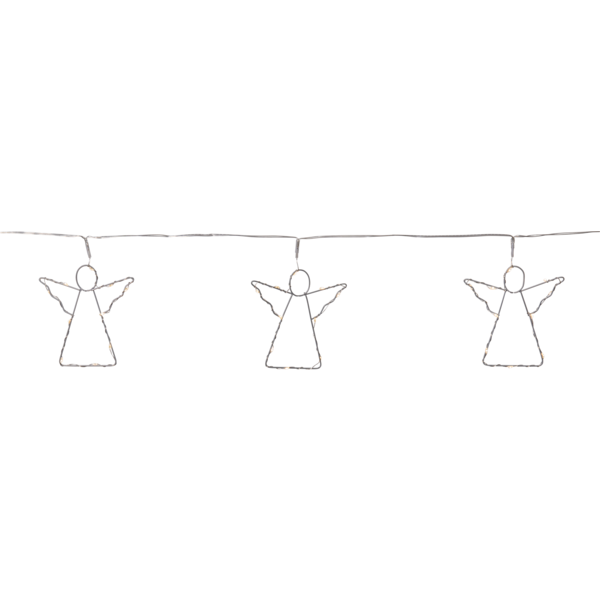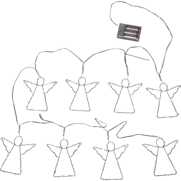 Ši dekoratyvinė LED girlianda susideda iš 8 elegantiškų metalinių angelų, kurių kiekvienas apšviestas 10 šiltai baltų LED lempučių. Iš viso – 80 mažų šviesos taškų, kurie sukuria švelnų, tolygų spindesį. Angelai pagaminti iš sidabro spalvos metalo, todėl atrodo moderniai, tačiau kartu išlaiko klasikinį Kalėdų simbolikos žavesį.