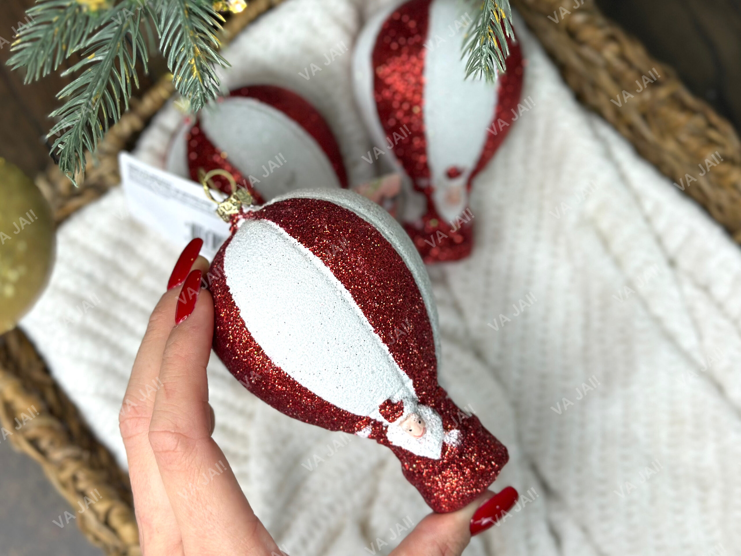 „Oro balionas“ dekoruotas ryškiomis, sodriomis raudonomis ir baltomis spalvomis – šventiška spalvų paletė, kuri puikiai dera tiek prie tradicinių, tiek prie šiuolaikiškų eglučių temų. Žaisliuko paviršius padengtas stambiomis, intensyviai žibančiomis blizgučių dalelėmis, kurios sukuria tviskančio sniego ar kristalizuotų ledo lašelių efektą. Tai ypač gražiai atsiskleidžia, kai ant žaisliuko krinta LED girliandų šviesa – efektas atrodo tarsi magija.