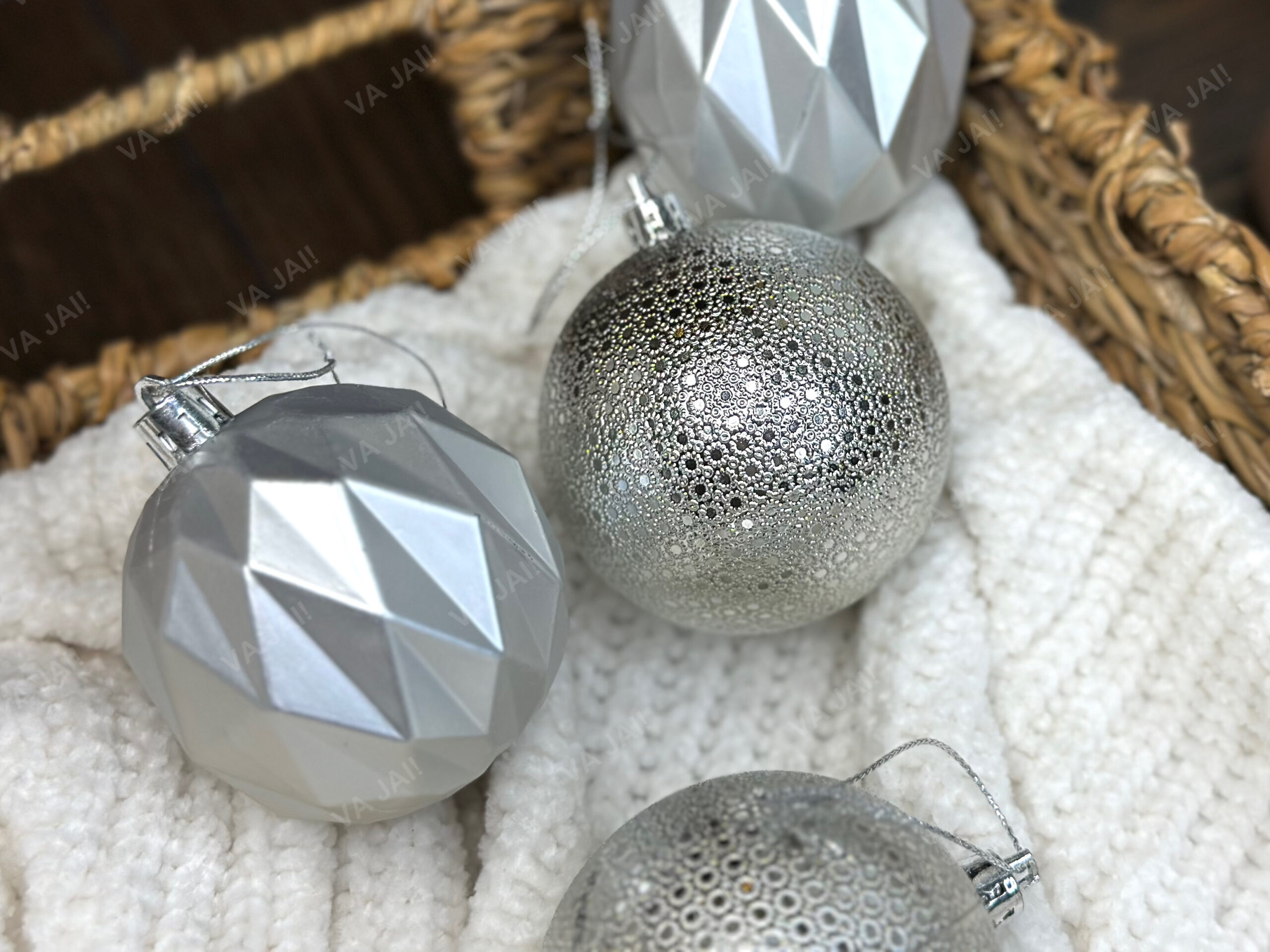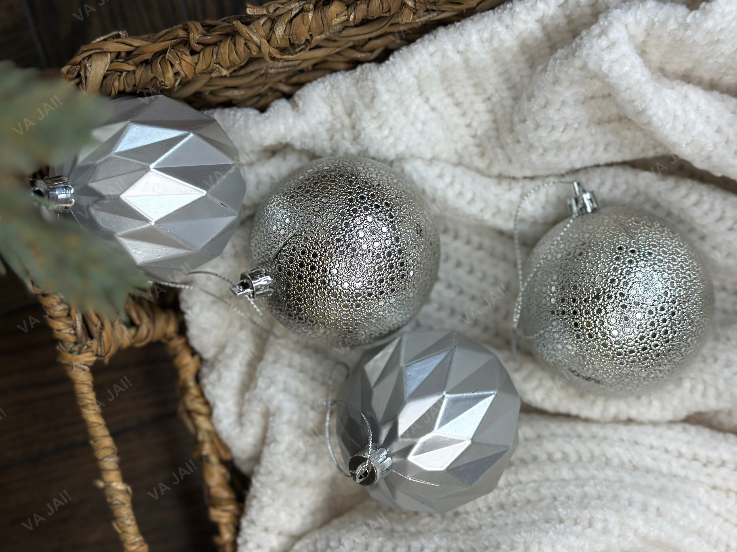 Tai – keturi nuostabūs, tarpusavyje harmoningai derantys eglutės žaisliukai, sukurti tam, kad Jūsų šventinis interjeras taptų skoningas, solidus ir šiuolaikiškas. Rinkinį sudaro 2 skirtingi dizainai – vienas matinis su išraiškingais geometriniais briaunavimais, primenančiais krištolo formas, o kitas – dekoruotas smulkiais ažūriniais raštais, kurie primena sidabro nėrinius ar žvaigždėtą dangų. Šis kontrastas – tarsi Kalėdų dvasią atspindintis dialogas tarp modernumo ir klasikos.