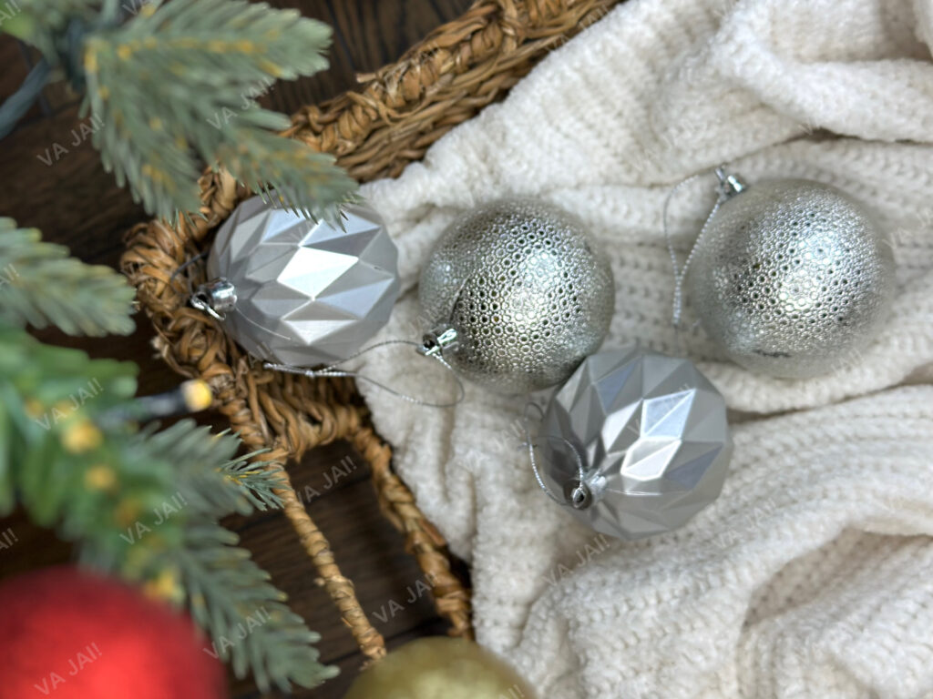 Sidabrinių eglutės žaisliukų rinkinys „Silver“ – elegancija, blizgesys ir saugumas viename.