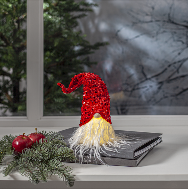 Šis 32 cm aukščio nykštukas pagamintas itin kruopščiai, su dėmesiu kiekvienai detalei. Jo raudona kepurė padengta žėrinčiomis blizgučių (sequins) detalėmis, kurios švelniai atspindi šviesą ir suteikia žaismingo spindesio. Kepurės forma – šiek tiek svyranti į šoną – suteikia žmogiško charakterio ir šiltos šypsenos pojūtį, tarsi mažasis Kalėdų padėjėjas stebėtų jus iš palangės.