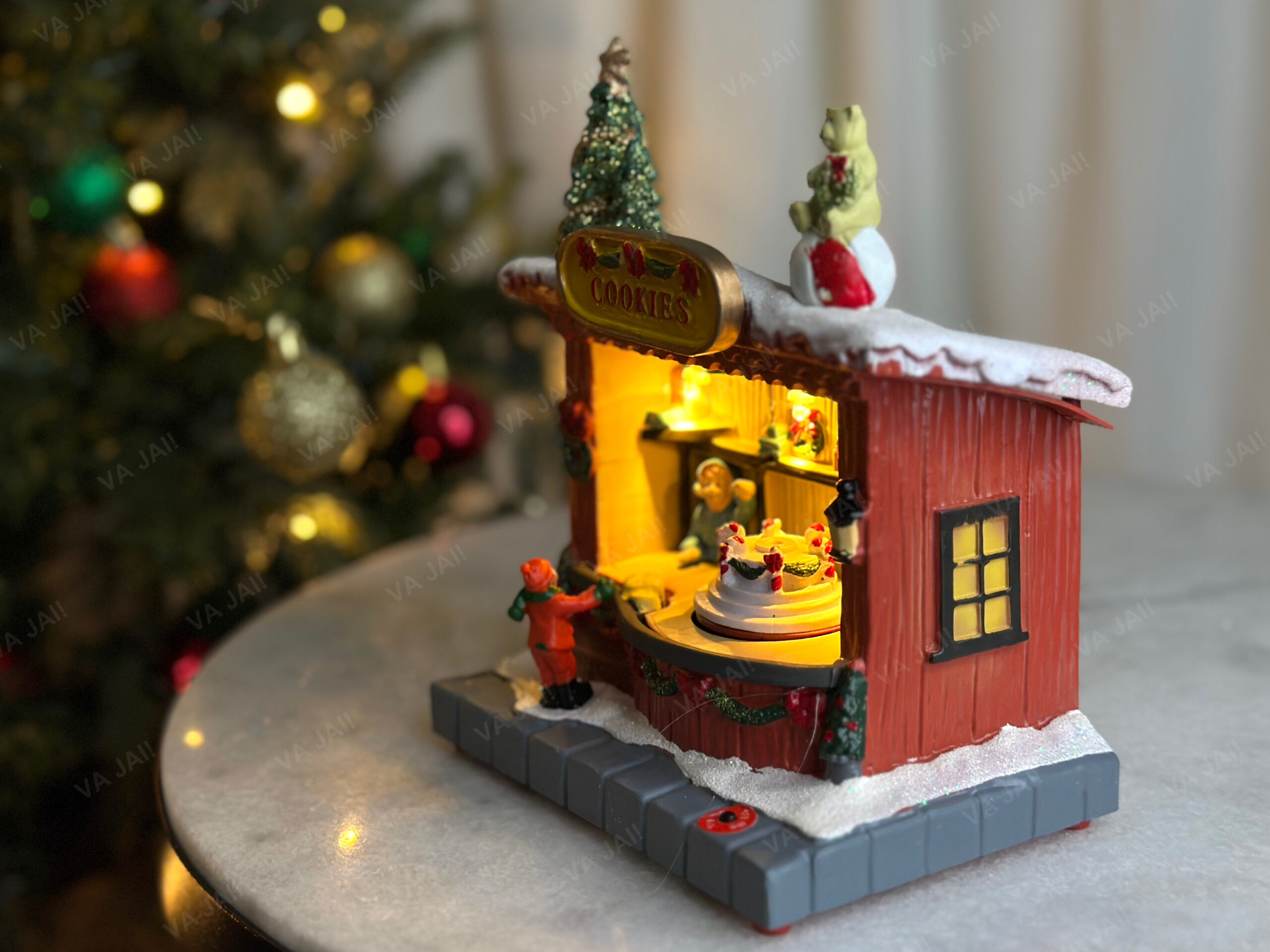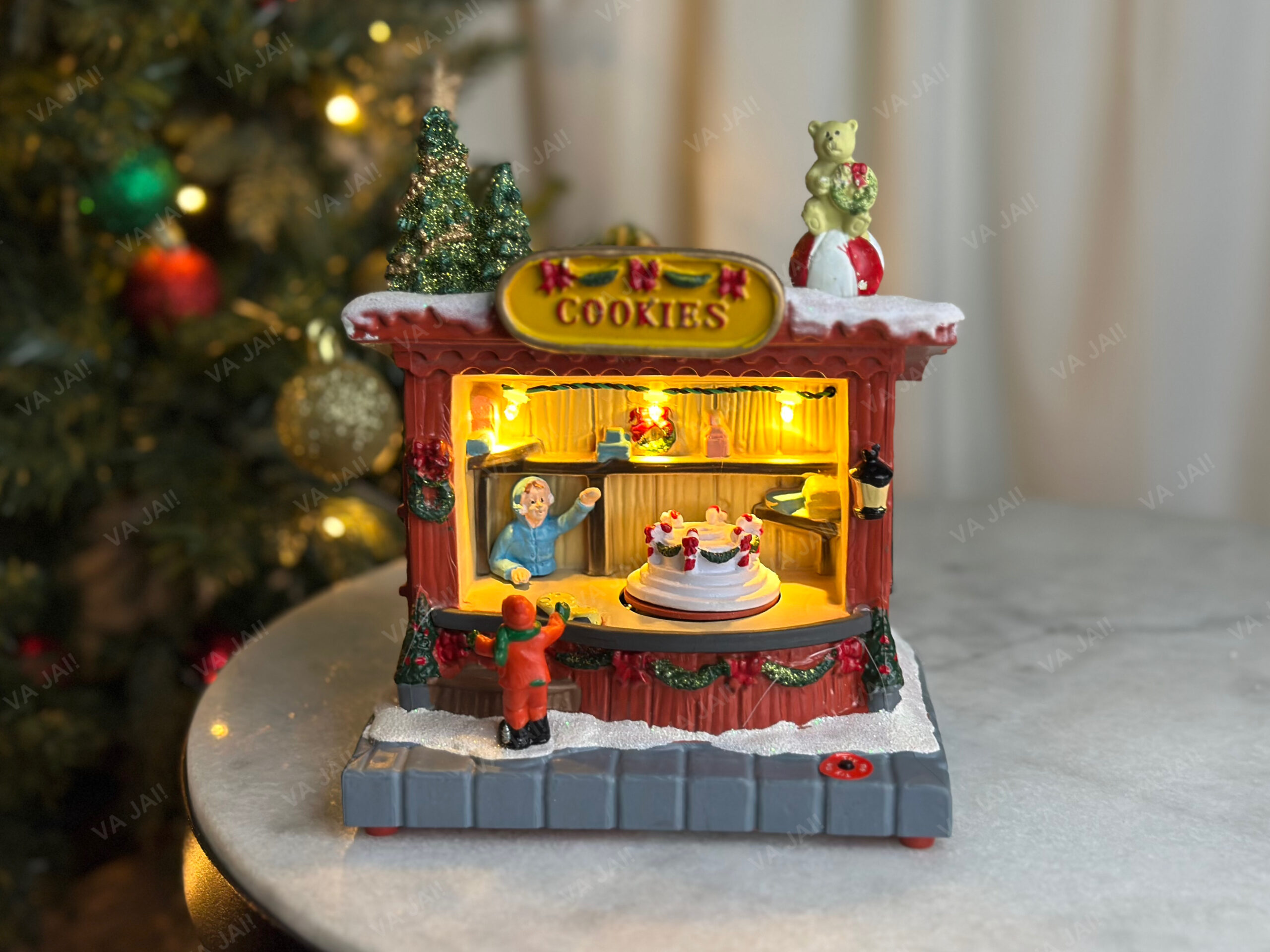 Šis nuostabus muzikinis akcentas atkartoja kalėdinę kepyklėlę – raudonos spalvos medinį kioską, dekoruotą snieguotais stogeliais, visžaliais medeliais ir šventiniais vainikais. Ant stogo pūpso meškiukas su kalėdiniu kamuoliuku – mielas akcentas, kuris pradžiugins tiek mažus, tiek didelius. Ant pastato fasado puikuojasi ryškiai geltonas užrašas „COOKIES“, o viduje – šventinė scena, kurioje mažasis kepėjas stebi, kaip ant besisukančios platformos sukasi šventinis tortas, puoštas vyšniomis ir grietinėle.