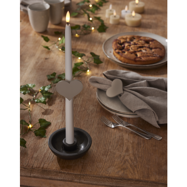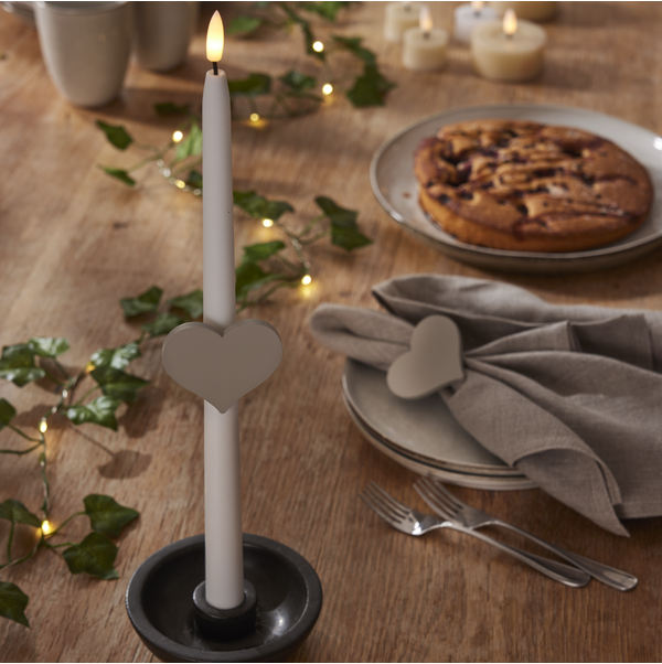 Širdelės paviršius nudažytas švelnia smėlio (beige) atspalviu – natūrali spalva, kuri puikiai dera prie bet kokio interjero. Ji neperkrauna erdvės, o subtiliai įsilieja į žvakidės dizainą, suteikdama jai naują vizualinį charakterį. Tai universalus tonas, harmoningai derantis tiek su balta, tiek su medžio, pilka ar juoda žvakide.