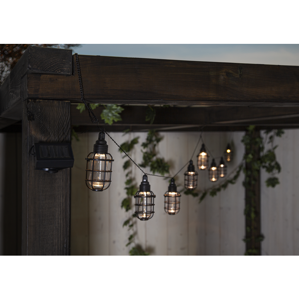Aštuonios pakabinamos lemputės apgaubtos juodo plastiko narvelio tipo gaubtais, primenančiais senovinius pramoninius šviestuvus. Tai suteikia girliandai išskirtinį, šiek tiek „retro loft“ įvaizdį, kuris idealiai dera prie medinių, metalinių ar betoninių lauko interjero detalių.