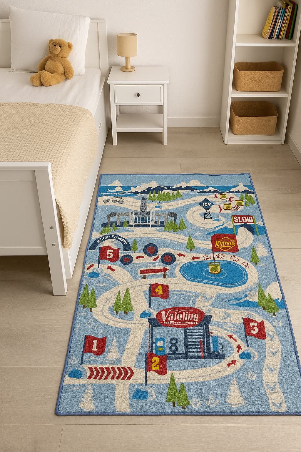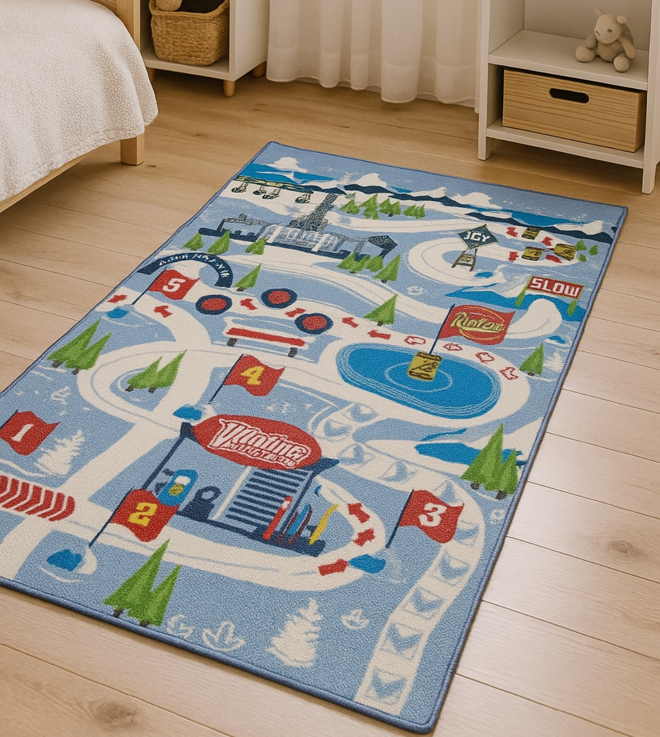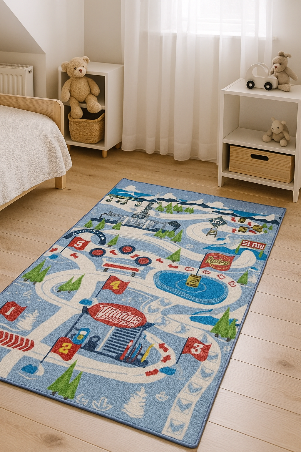 Spalvingas dizainas su lenktynių trasa, skaičiais, degaline, ženklais ir sniego peizažu ne tik atrodo įspūdingai, bet ir lavina vaikų erdvinį suvokimą, skaičių atpažinimą bei kūrybinį mąstymą. Vaikai gali kurti istorijas, važinėti mašinėlėmis pagal pažymėtus kelius, įsivaizduoti varžybas ar sniego nuotykius su mėgstamais personažais.