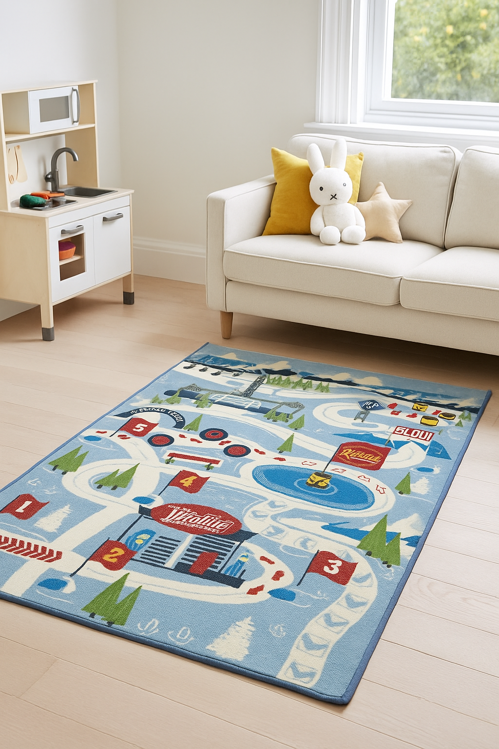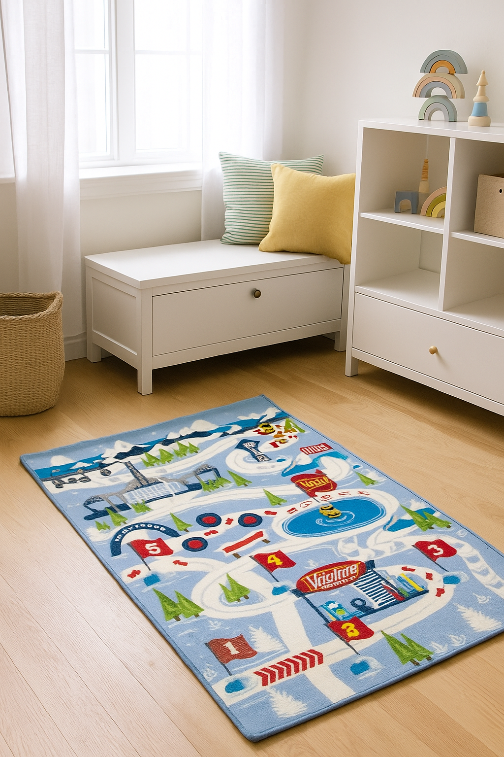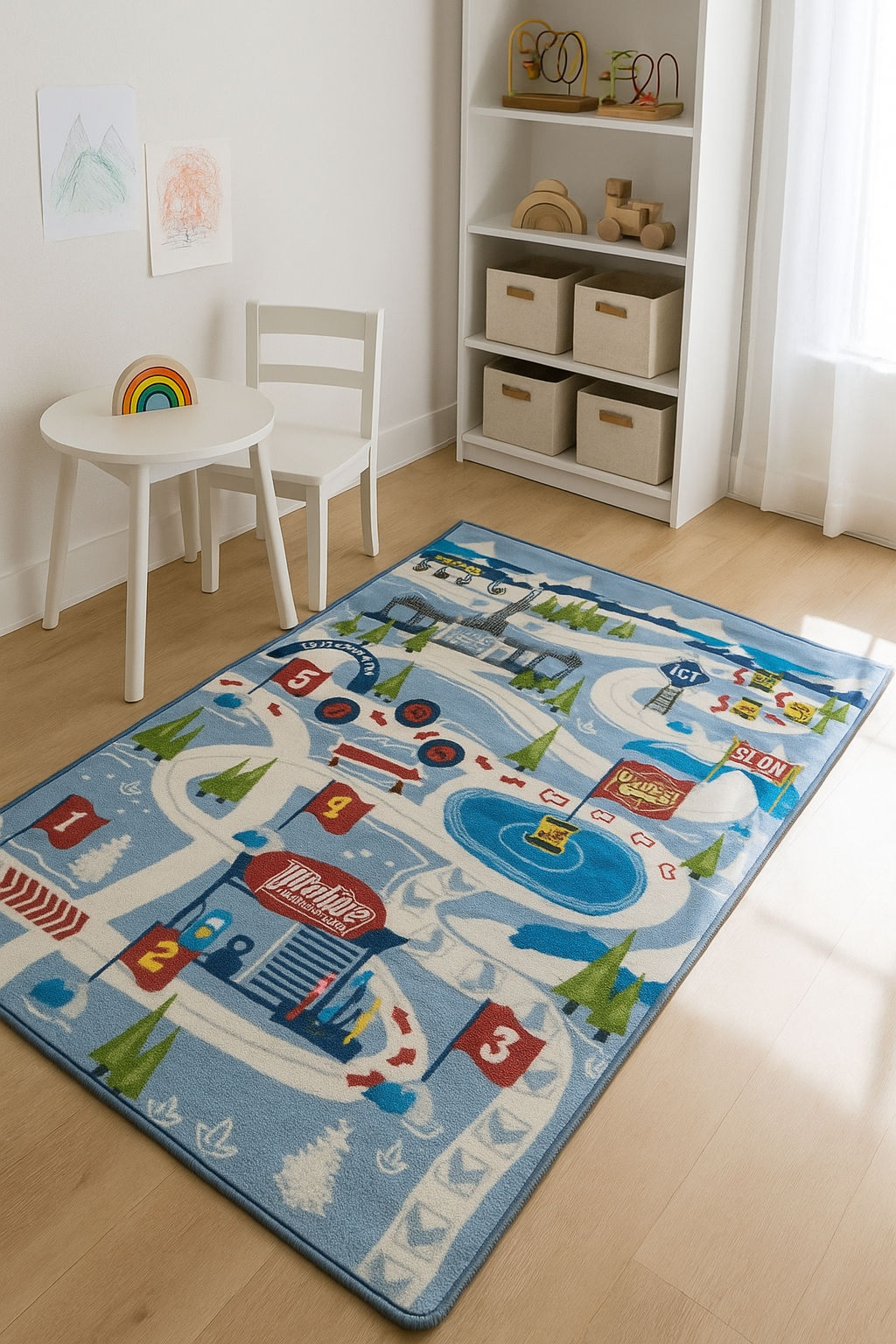 Spalvingas dizainas su lenktynių trasa, skaičiais, degaline, ženklais ir sniego peizažu ne tik atrodo įspūdingai, bet ir lavina vaikų erdvinį suvokimą, skaičių atpažinimą bei kūrybinį mąstymą. Vaikai gali kurti istorijas, važinėti mašinėlėmis pagal pažymėtus kelius, įsivaizduoti varžybas ar sniego nuotykius su mėgstamais personažais.