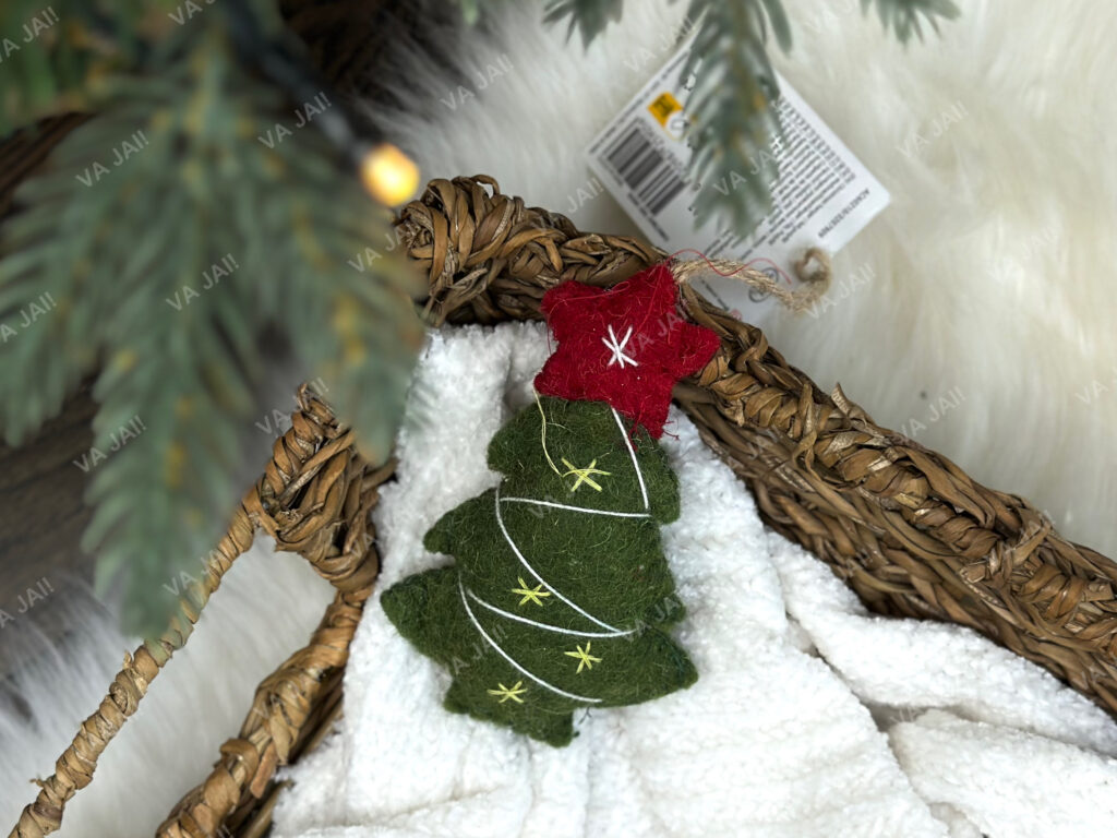 Šis eglutės žaisliukas išsiskiria tradicine Kalėdų eglutės forma su viršuje siuvinėta raudona žvaigžde – simbolizuojančia šviesą, viltį ir šventinę dvasią. Žaisliuko paviršius puoštas siuvinėtais geltonais kryžiukais, primenančiais žvaigždutes, bei balta „girlianda“, švelniai apsukta aplink visą eglutę. Visa tai – ne masinė spauda ar klijai, o tikras rankų darbo estetinis pojūtis, kuris dvelkia meile ir šiluma.