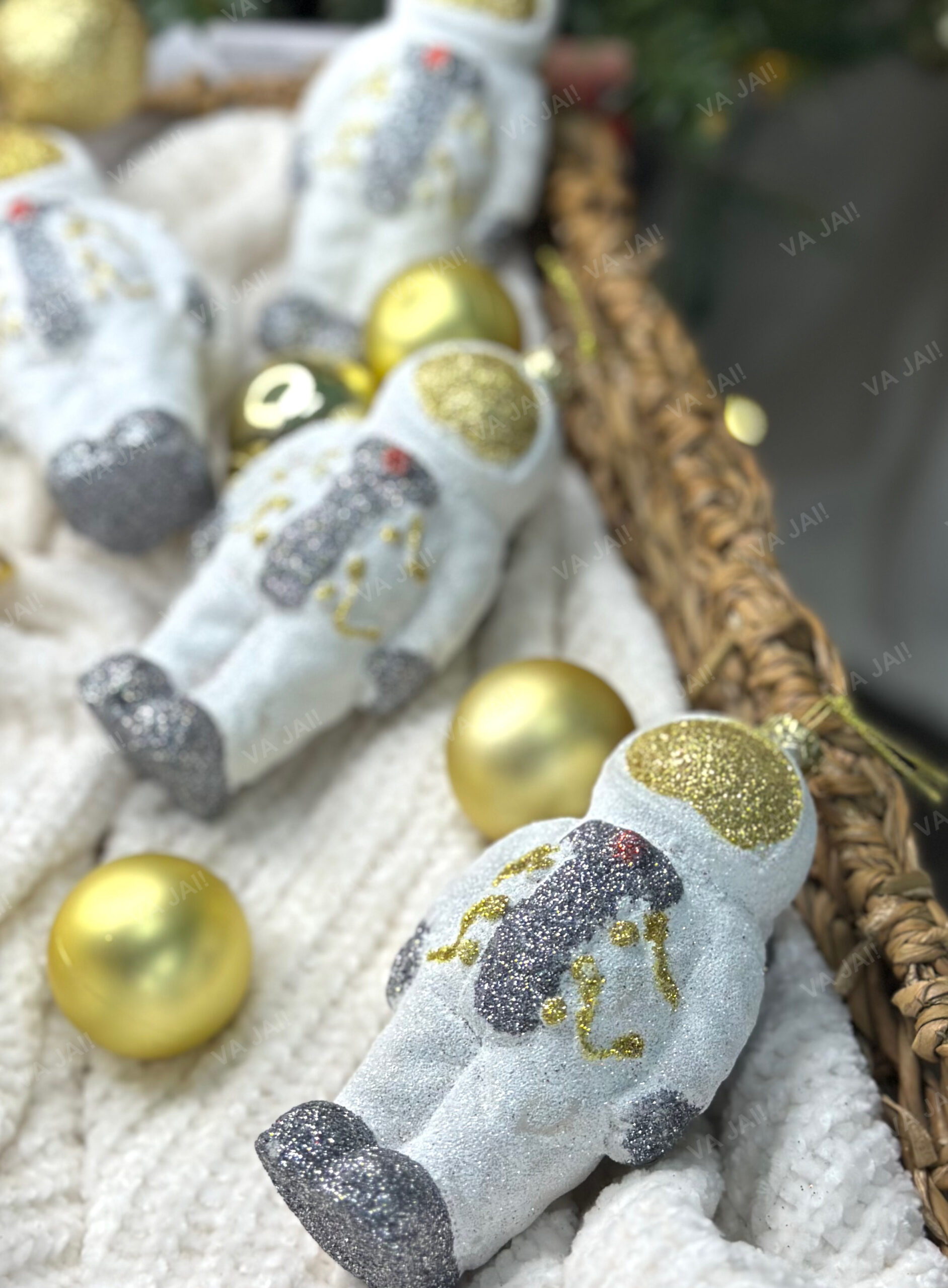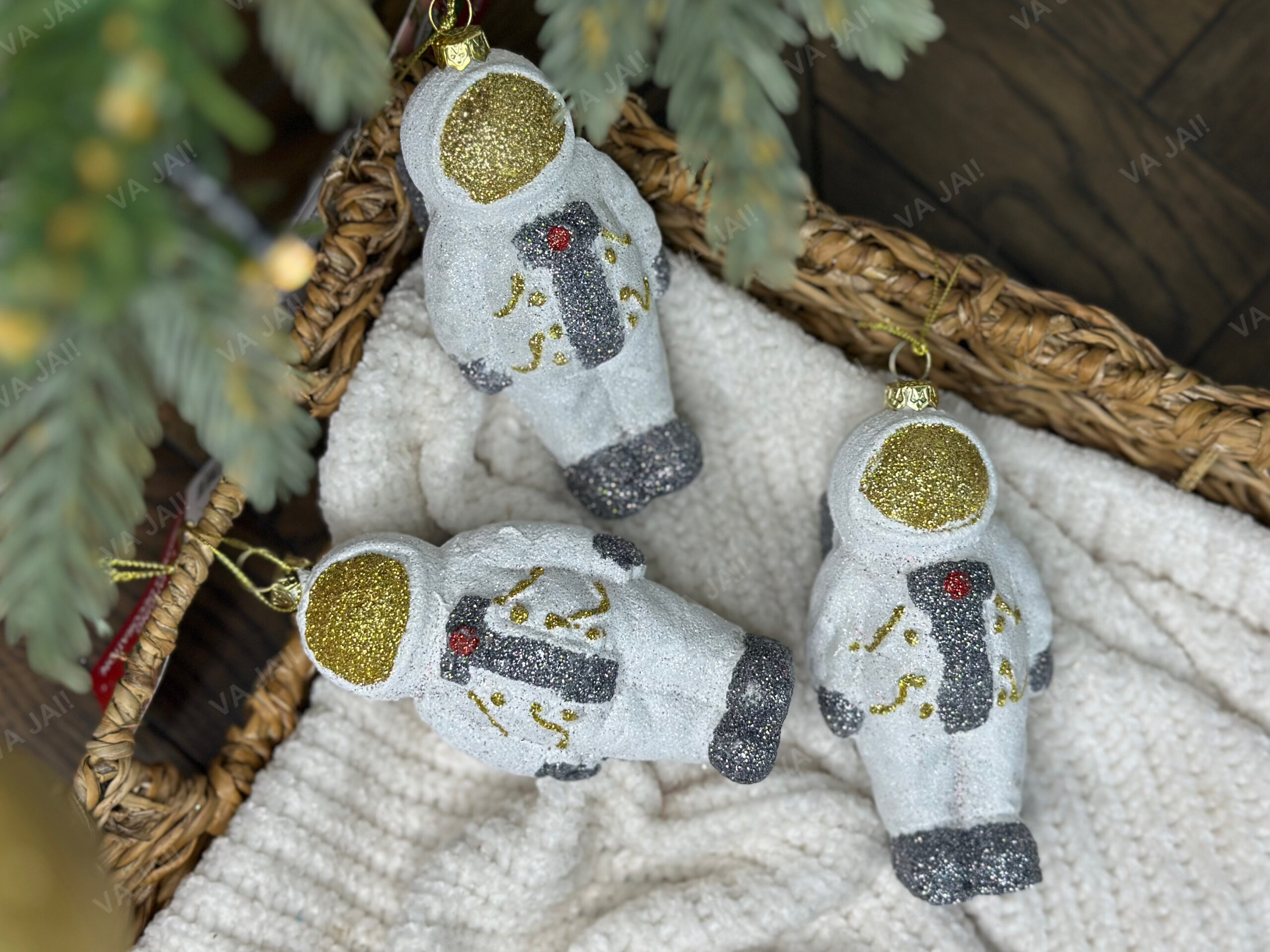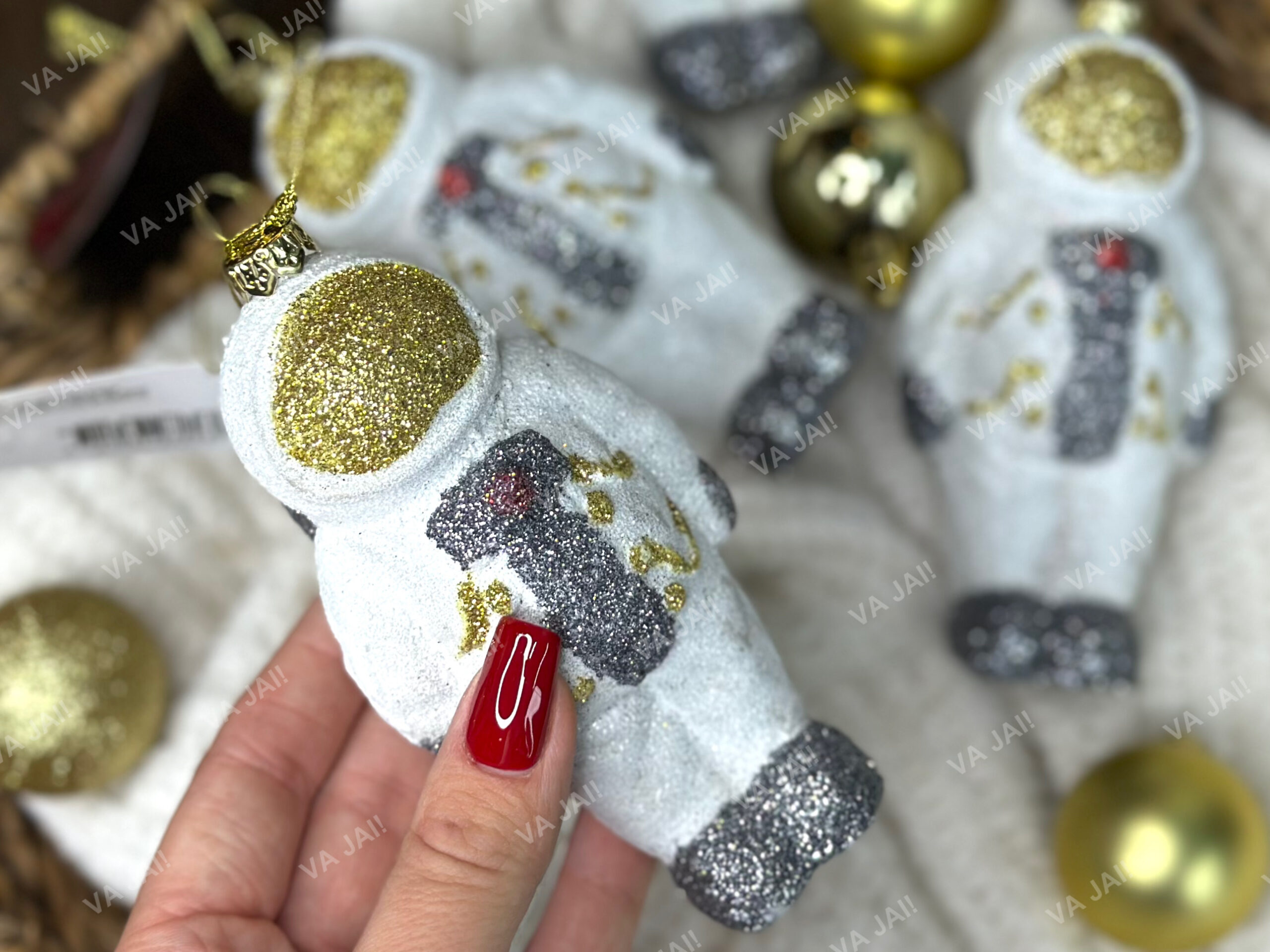 Dekoracija sukurta pagal klasikinio kosmonauto aprangą: didelis, suapvalintas šalmas su auksiniu veidrodiniu efektu primena astronautų skafandrus, kuriuos matome NASA arba SpaceX išklotinėse. Išryškintos rankų ir kojų formos, detalizuotas deguonies tiekimo kuprinės dizainas – visa tai perteikta šiltai, bet tikroviškai. Baltos ir sidabrinės spalvos derinamos su auksiniais ir juodais akcentais, todėl žaisliukas traukia akį ir sukuria rafinuotą įspūdį.