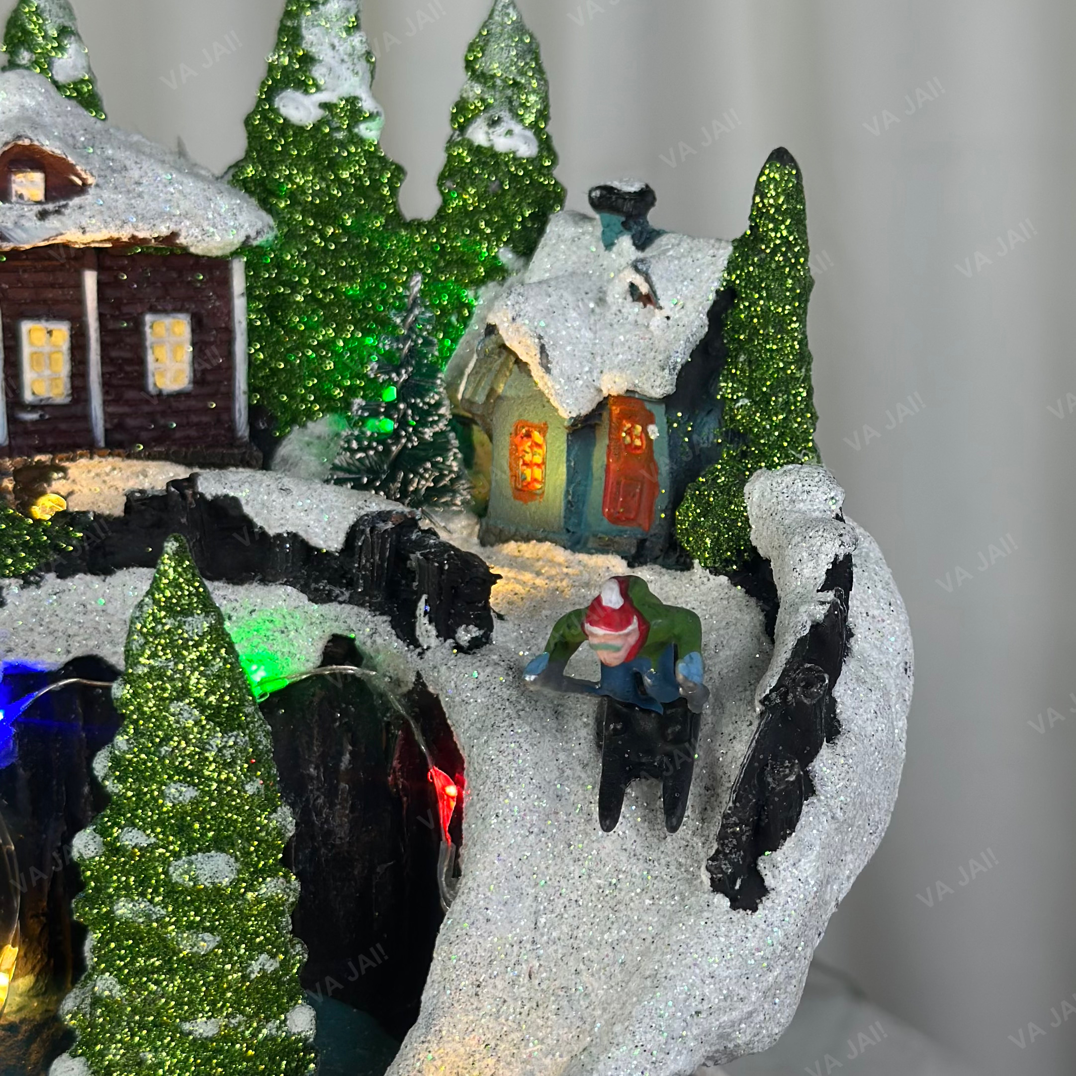 Dekoracija pasižymi įspūdingu detalumu – sniegu užklotos trobelės, žaliuojančios eglutės, spalvingi personažai ir šiltai švytintys namų langai sukuria gyvą ir jaukų vaizdą. Ypatingą atmosferą kuria važiuojantis traukinukas, kuris, lyg iš senovinių pasakų, sklandžiai suka ratą aplink miestelį. Tai detalė, kuri išskiria šį miestelį iš daugybės kitų dekoracijų.