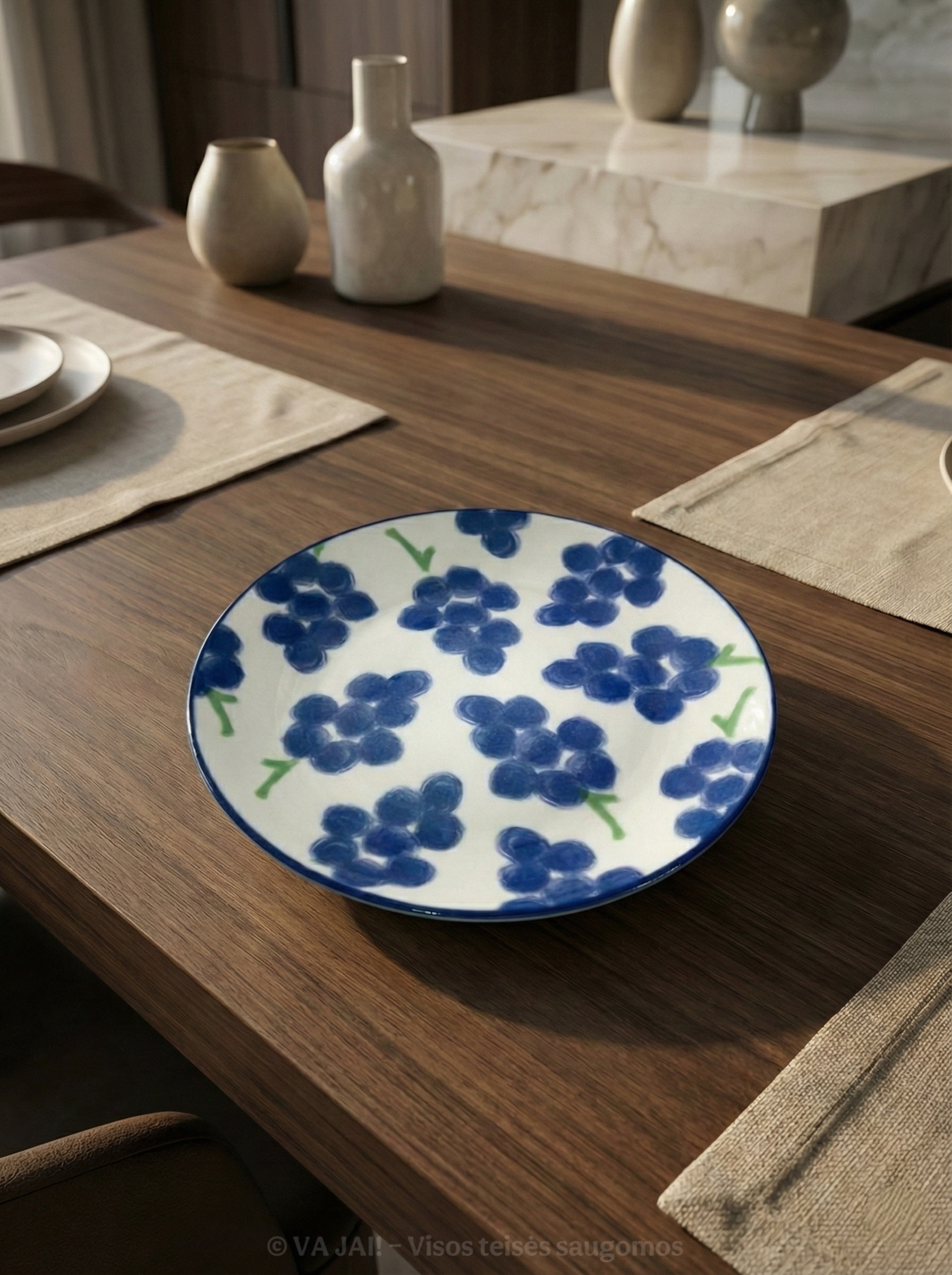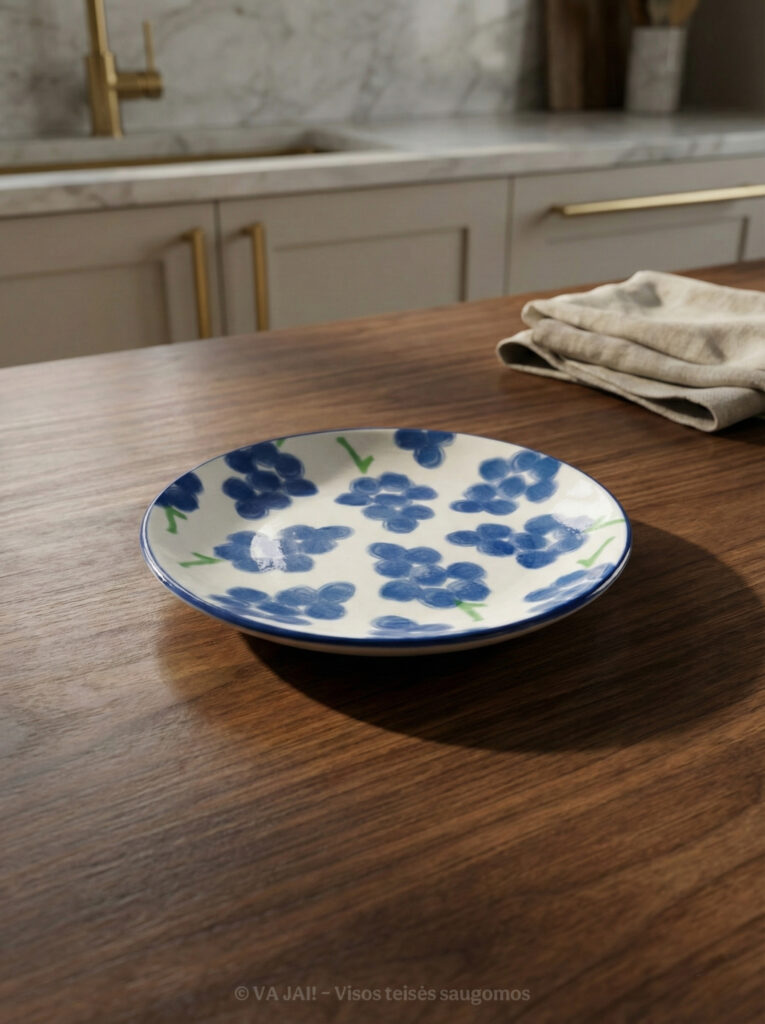 Lėkštės dizainas primena rankomis tapytą keramiką. Vynuogių formos nėra visiškai vienodos, jų kontūrai šiek tiek minkšti, natūralūs. Tai sukuria autentiškumo ir rankų darbo įspūdį. Mėlyni atspalviai dera su žaliais koteliais, o visas piešinys atrodo harmoningas ir neperkrautas.