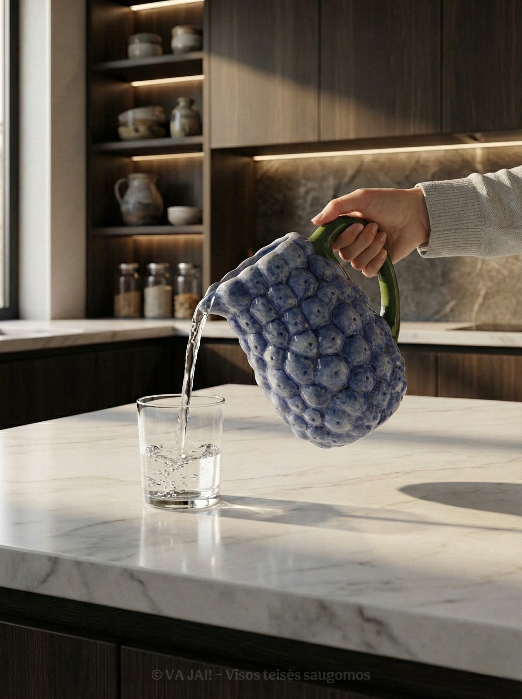 Šis ąsotis neapsiriboja vien tik gėrimų patiekimu. Jį galima naudoti ir kaip dekoratyvinę vazą – šviežioms gėlėms, džiovintoms šakelėms ar net virtuvės įrankiams laikyti. Dėl savo išraiškingos formos ir reljefo jis atrodo estetiškai net ir tuščias, pastatytas ant virtuvės salos, lentynos ar stalo. Tai daiktas, kuris „gyvena“ interjere ir suteikia jam charakterio.