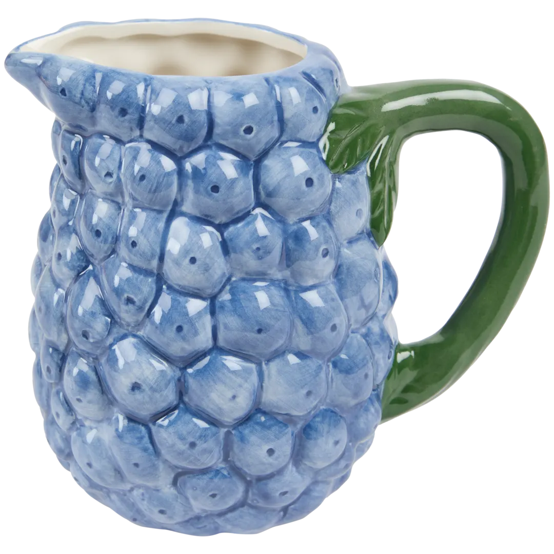 Reljefinis keraminis ąsotis gėrimams ir serviravimui, išsiskiriantis vynuogių motyvu, sodria spalva ir jaukiu dizainu kasdieniam naudojimui.