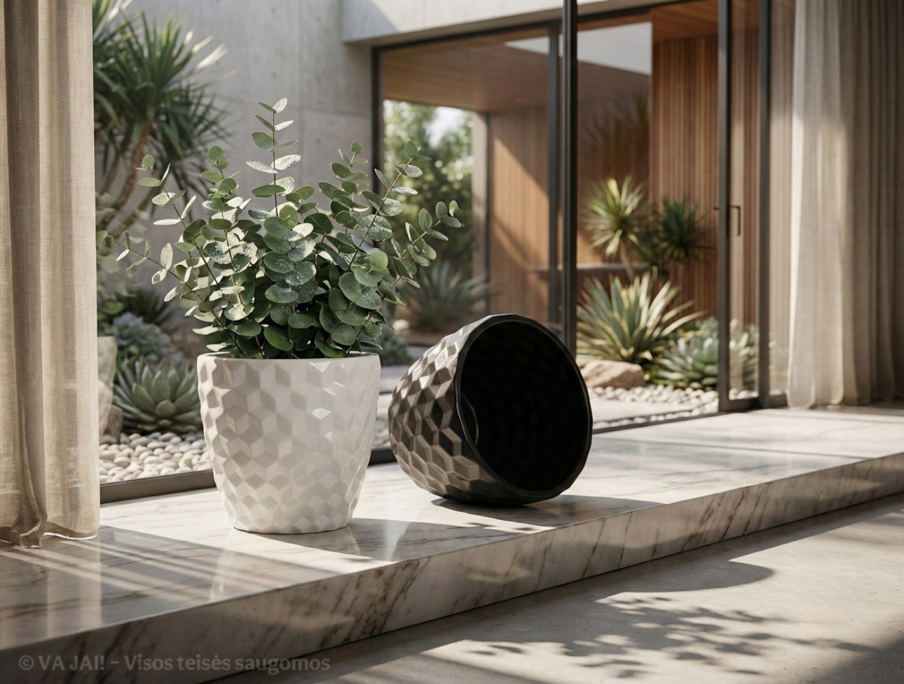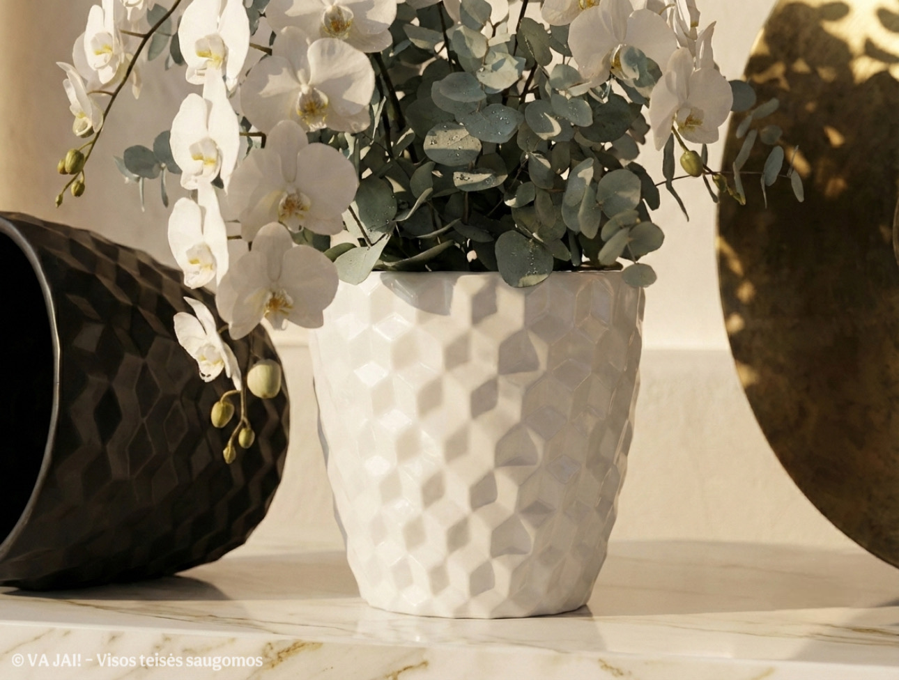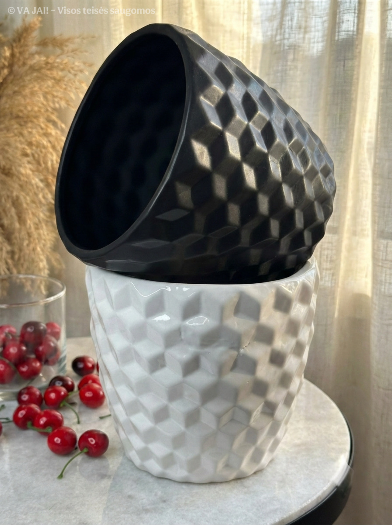 • „Onyx“ vazonas traukia dėmesį dėl savo geometrinio, erdvinio reljefo, kuris sukuria šviesos ir šešėlių žaismą, suteikiančią vizualinio gylio efektą.