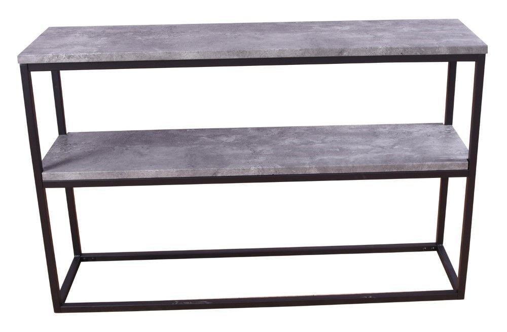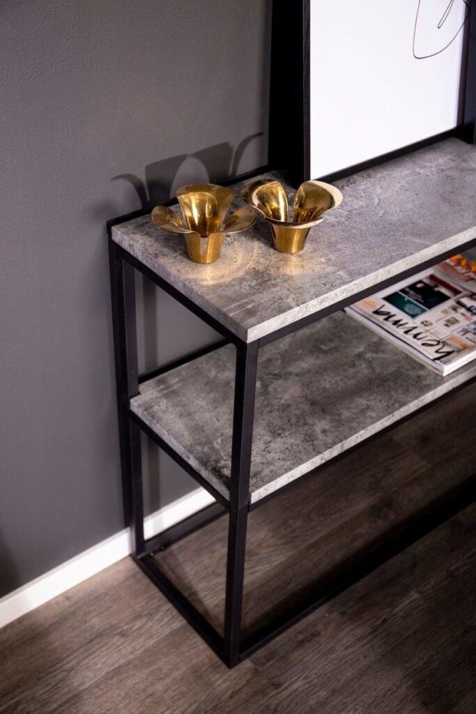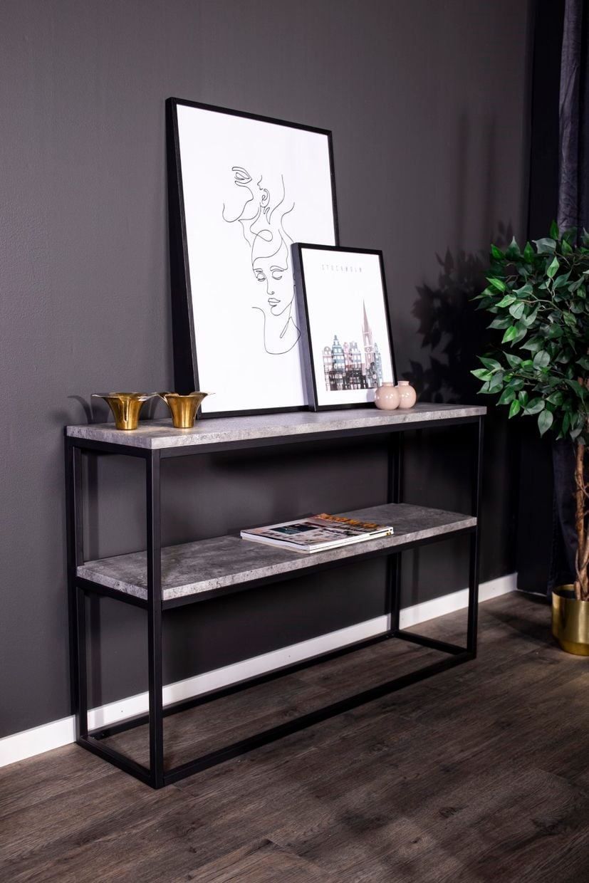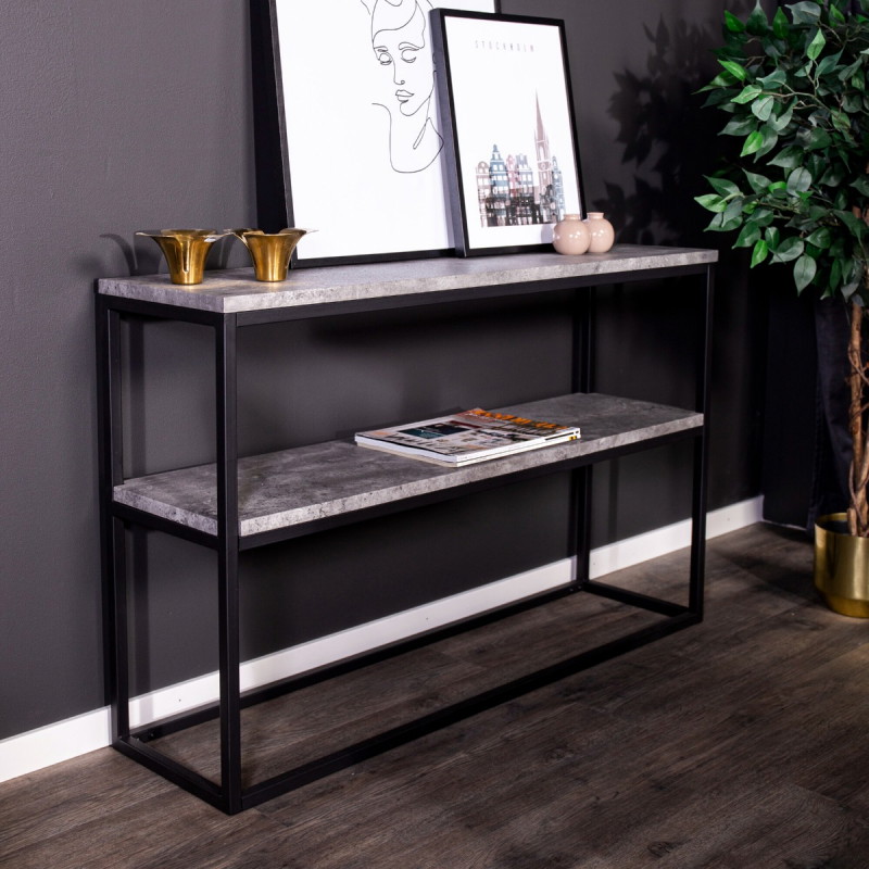 Industrinio stiliaus konsolinis staliukas „Rise“ su betono imitacijos lentynomis ir tvirtu plieno rėmu. Dvi erdvios plokštumos išlaiko net po 30 kg apkrovą.