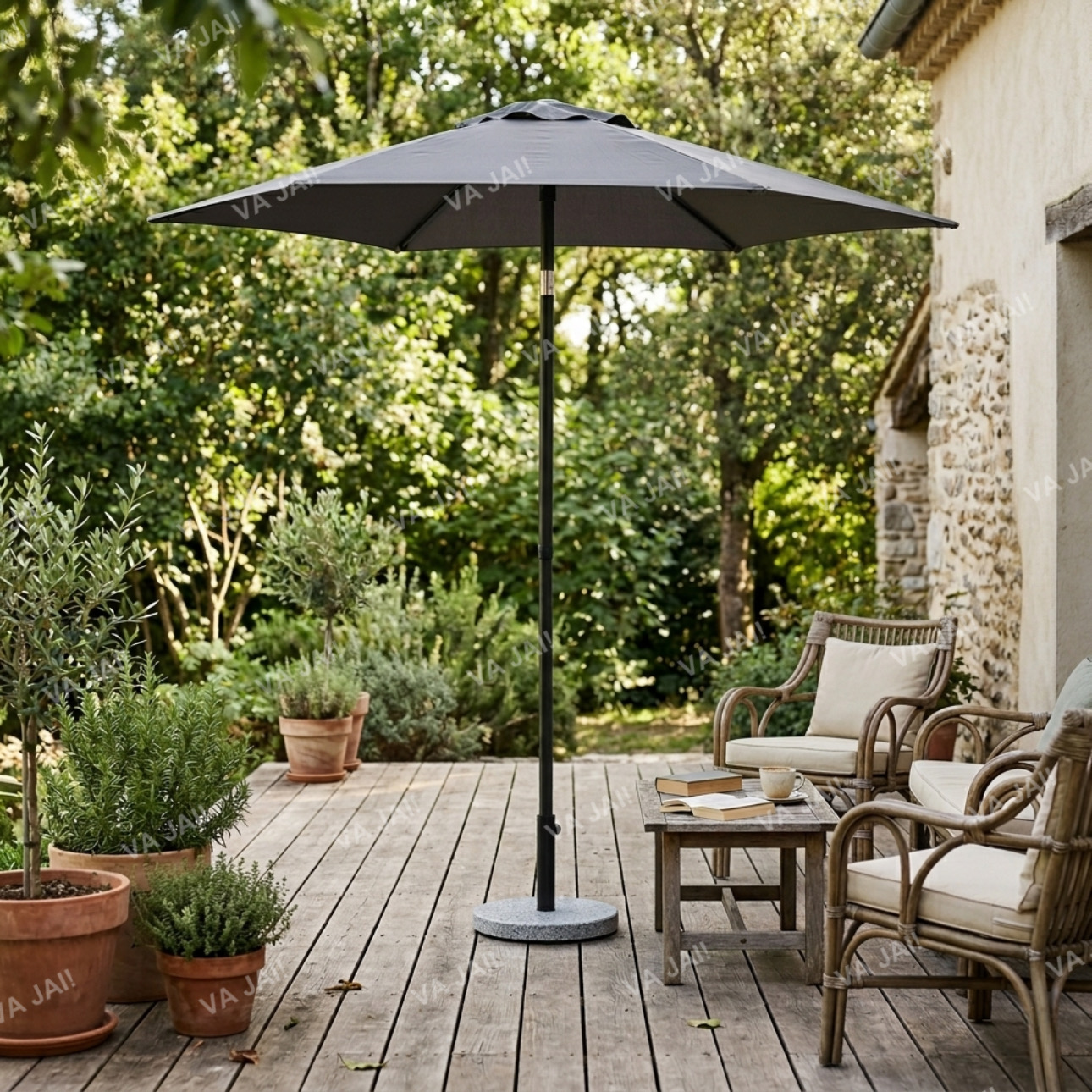 Skandinaviškas dizainas: Antracito pilkos spalvos skėtis idealiai dera prie modernaus ar minimalistinio eksterjero. Neutralus atspalvis nesipjauna su aplinkos spalvomis, tad tiks tiek prie medinių terasų, tiek prie betoninių grindinių ar akmens dekoracijų.