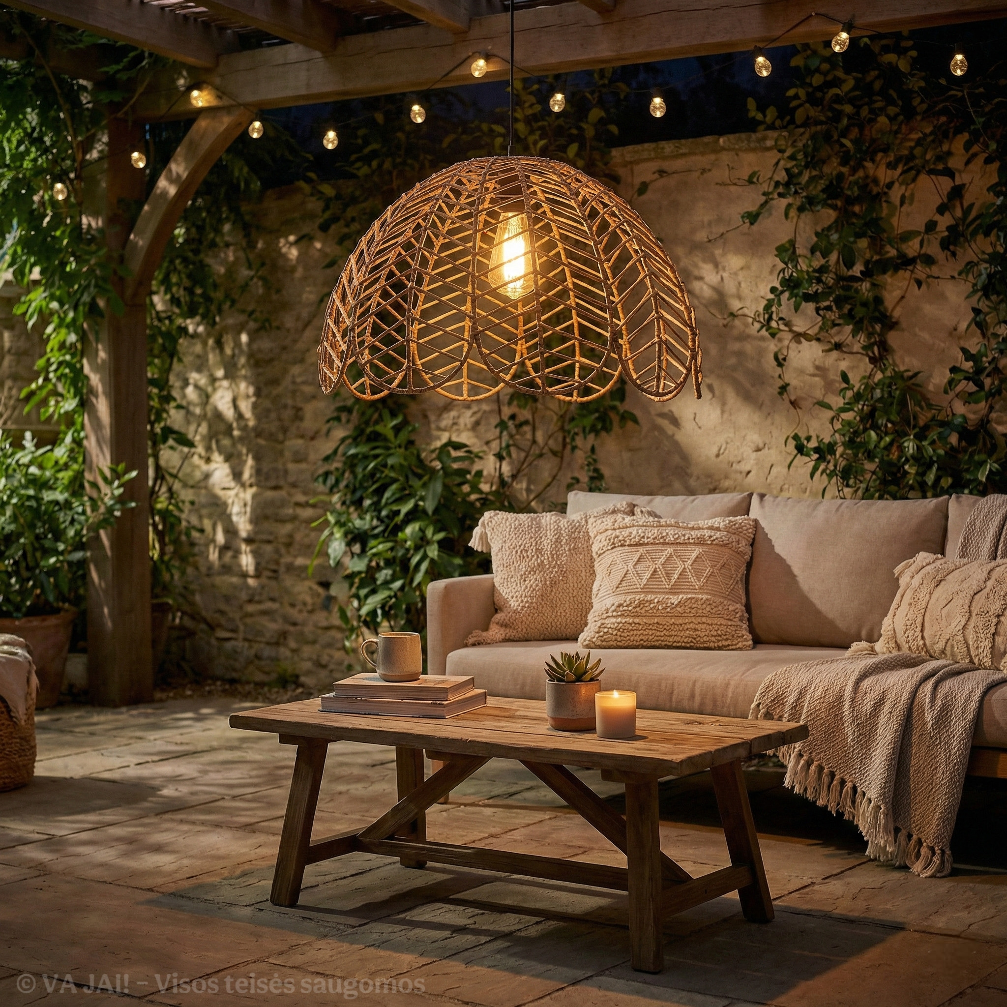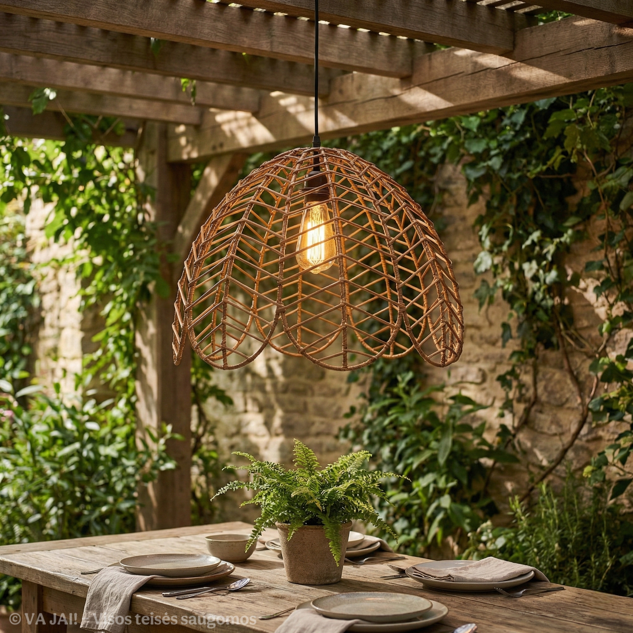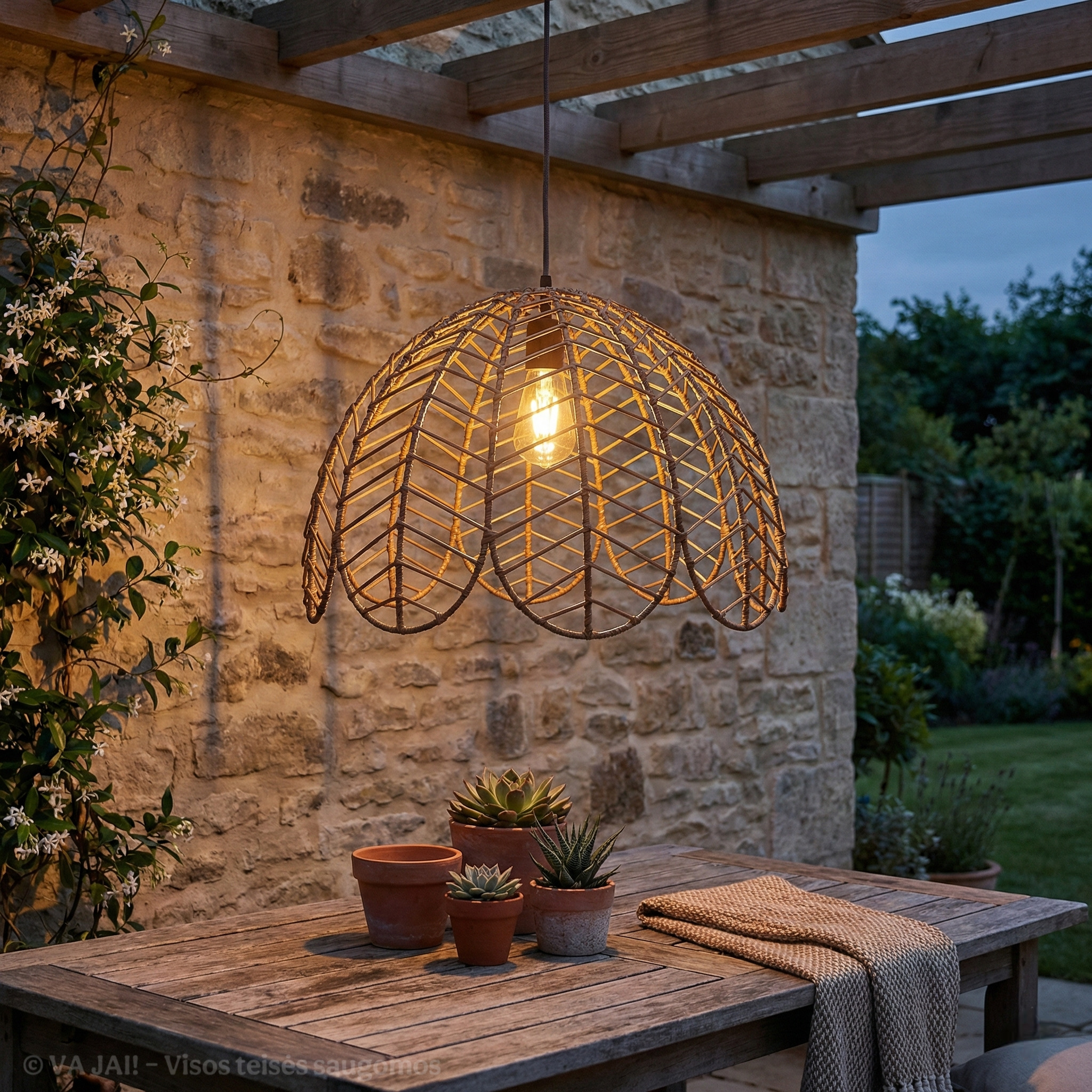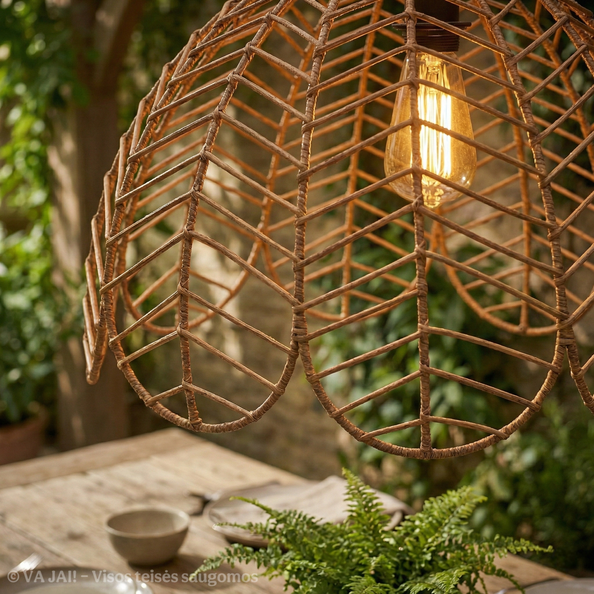 Metalinis karkasas užtikrina konstrukcijos tvirtumą ir stabilumą, todėl šviestuvo gaubtas išlaiko formą net ir po ilgo naudojimo lauke. Karkasas padengtas taip, kad būtų atsparus drėgmei bei temperatūrų pokyčiams, o dirbtinis ratanas pasirinktas dėl savo patvarumo ir lengvos priežiūros. Skirtingai nei natūralios medžiagos, dirbtinis ratanas neblunka nuo saulės, neskyla ir nepraranda estetinės išvaizdos net esant intensyviam naudojimui lauko sąlygomis.