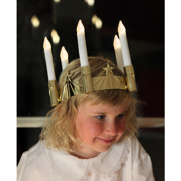 Šiuolaikinėje versijoje, vietoj tikrų žvakių naudojamos LED lemputės – jos suteikia tokį patį jaukų ir šiltą švytėjimą, tačiau yra visiškai saugios. LED karūna „Santa Lucia“ atkartoja šią tradiciją su elegantišku auksiniu pagrindu ir penkiomis baltomis žvakėmis, spindinčiomis šilta balta šviesa.