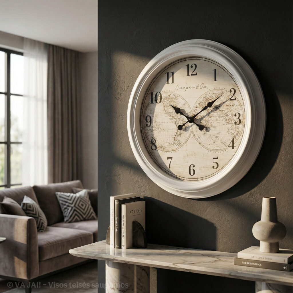 Laikrodžio natūralaus medžio rėmas suteikia visumai šilumos ir autentiškumo. Mediena interjere visada sukuria jaukumo jausmą, o čia ji dera su lengvai sendintu ciferblato fonu, kuris atrodo subtiliai nutrintas, tarsi laiko paliestas. Tai ne trūkumas, o sąmoningas dizaino sprendimas – laikrodis atrodo brandus, solidus ir turintis charakterį.