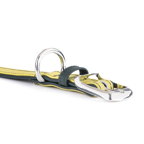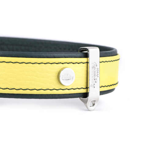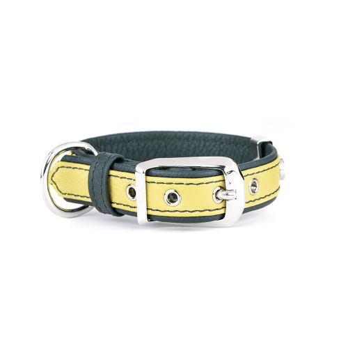 Geltonas „Firenze“ modelis – ypatingas dėl savo spalvos. Ji simbolizuoja energiją, džiaugsmą ir pozityvumą, todėl šio antkaklio neįmanoma nepastebėti pasivaikščiojimo metu. Ryški, bet elegantiška spalva puikiai dera su giliai žaliu pagrindu, sukuriančiu subtilų kontrastą. Tai spalvinis derinys, kuris tinka tiek švelnesnio temperamento šunims, tiek aktyviems, linksmiems ir žaismingiems keturkojams. Šis antkaklis vizualiai išryškina šuns charakterį, suteikdamas jam papildomo žavesio bei išskirtinumo.