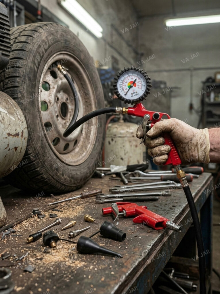 - Padangų pripūtimo pistoletas su manometru – leidžia tiksliai stebėti slėgį ir saugiai pripūsti automobilio, motociklo ar dviračio padangas.