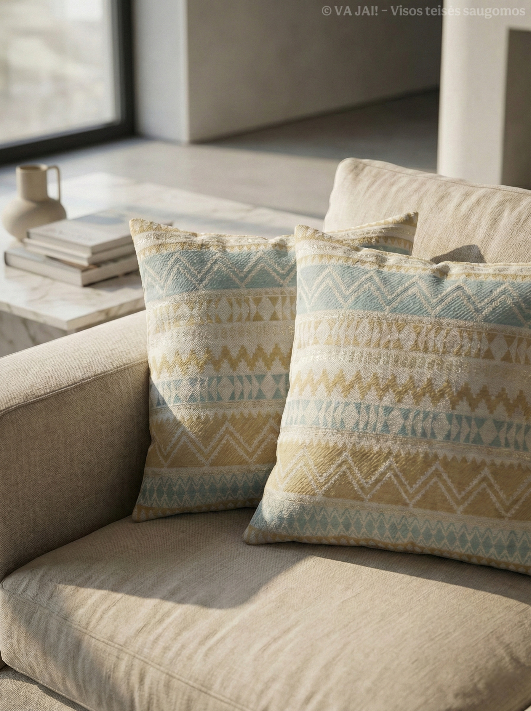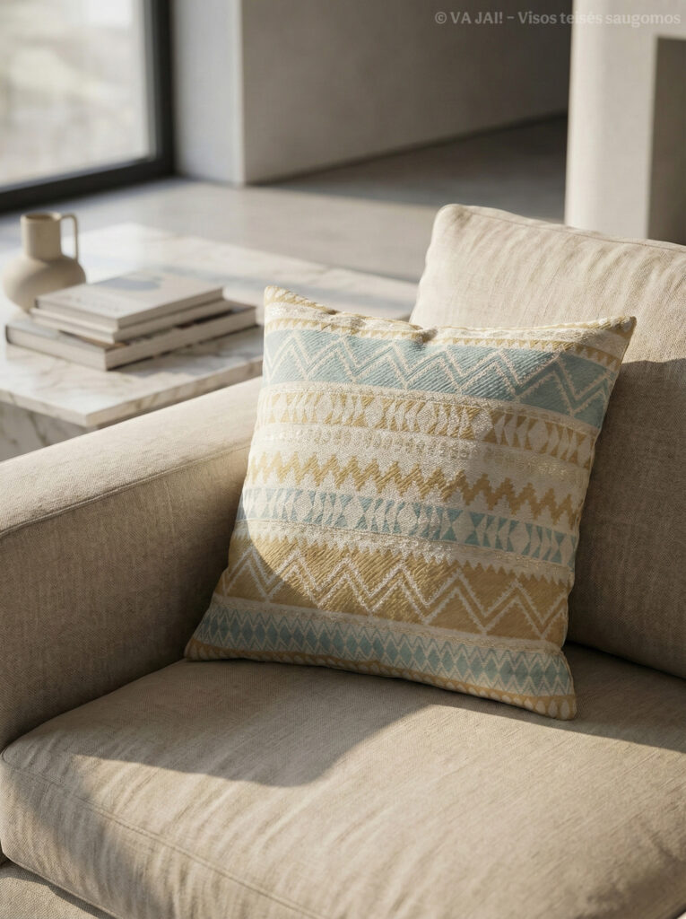 Nuotraukose matomas raštas išsiskiria subtiliais geometriniais motyvais, kurie primena rankų darbą ir natūralų audinių grožį. Smėlio spalvos dera su švelniais melsvais ir kreminiais atspalviais, todėl užvalkalas neatrodo per ryškus ar dominuojantis. Priešingai – jis ramina, subalansuoja erdvę ir tampa puikiu fonu kitiems interjero elementams.