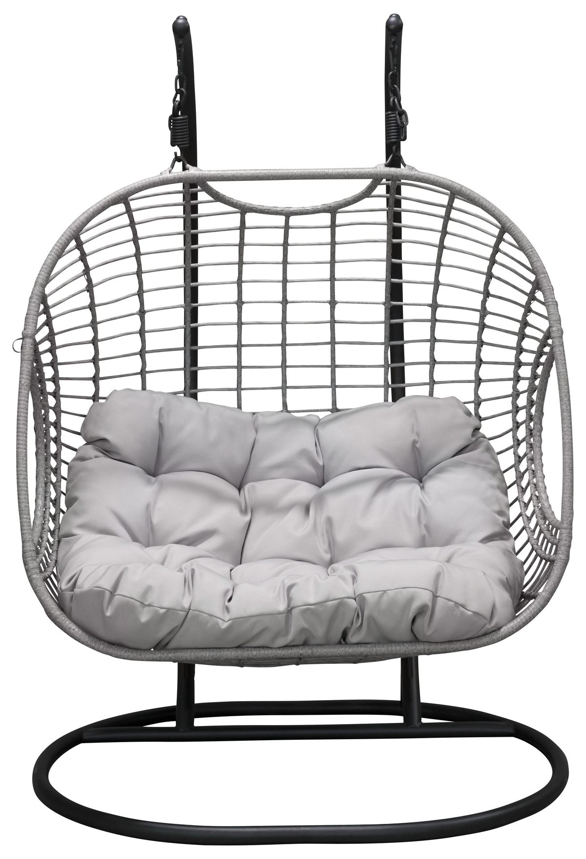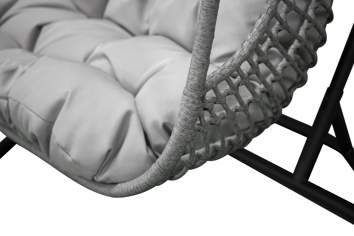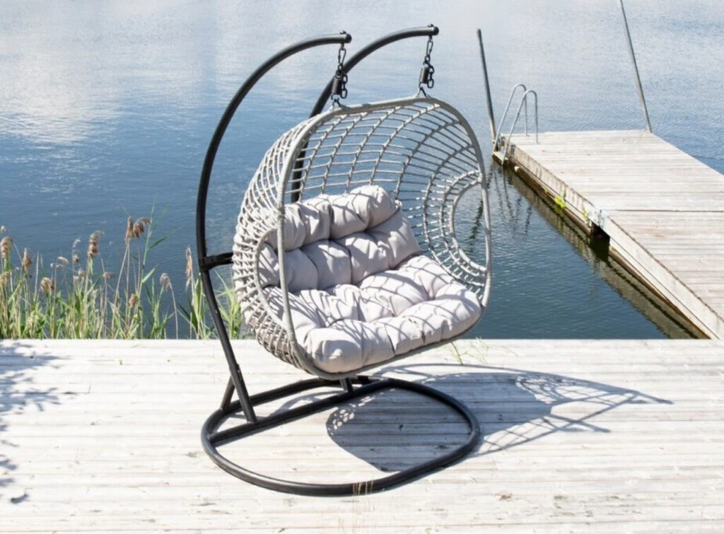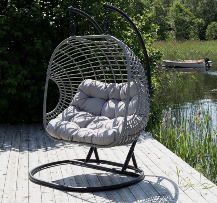 Erdvus dvigubas pakabinamas supamas krėslas su paminkštinimu – stilingas, patogus ir tvirtas sprendimas jaukiam poilsiui lauke.