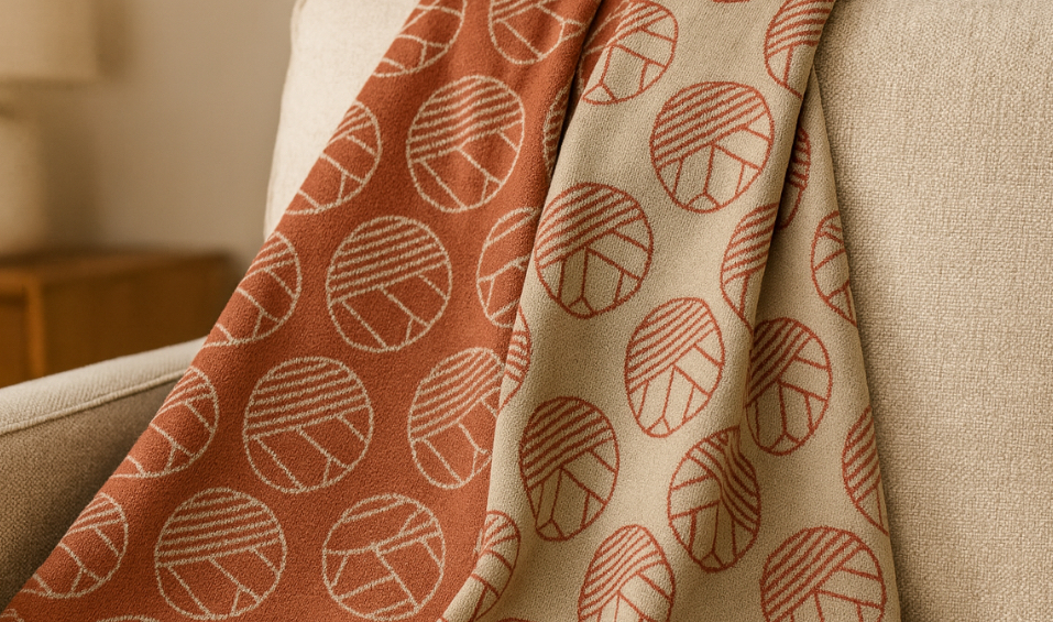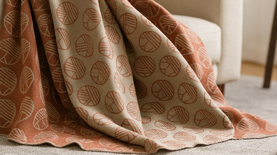 •Pledas dekoruotas švelniu žemės spalvų lapų raštu, kuris dera tiek prie modernaus, tiek prie klasikinio interjero.
