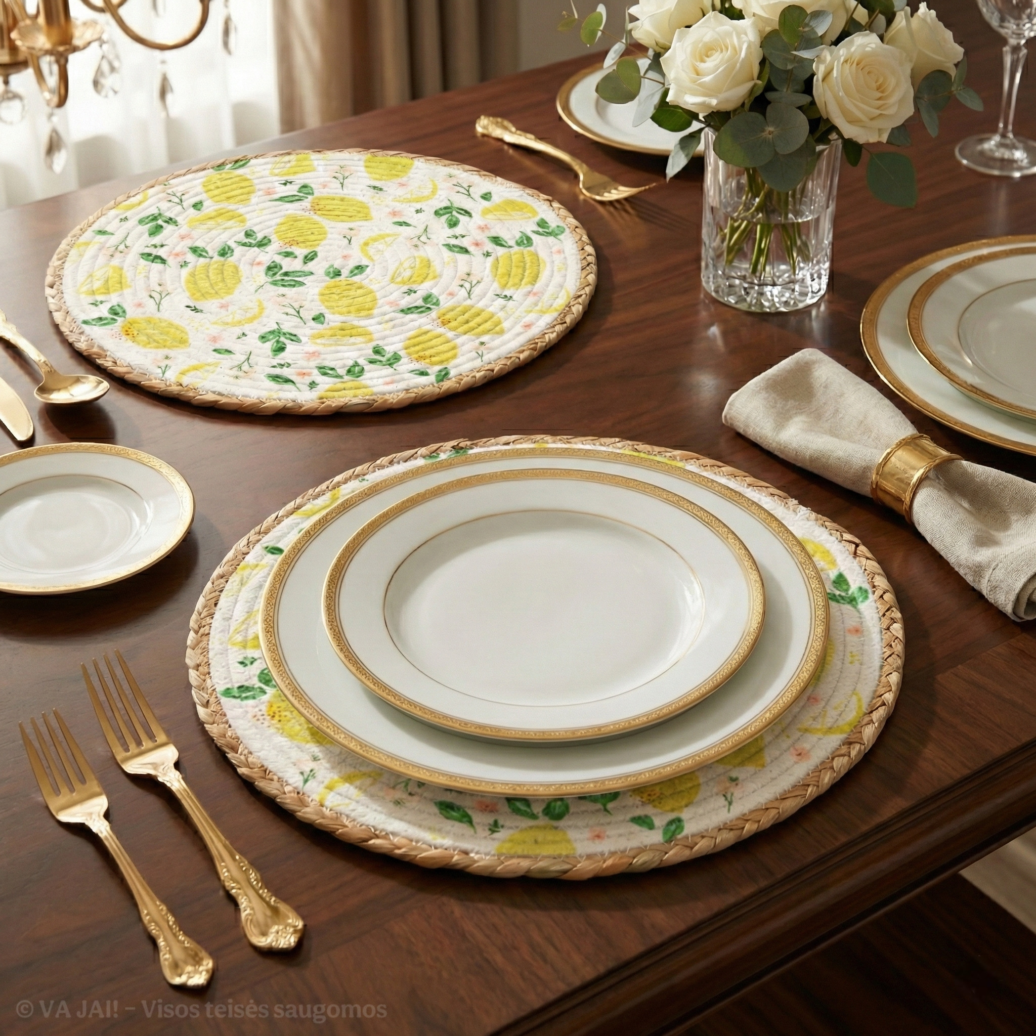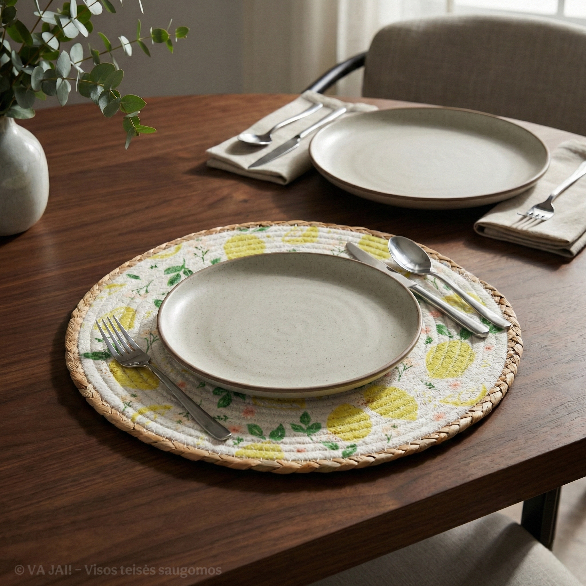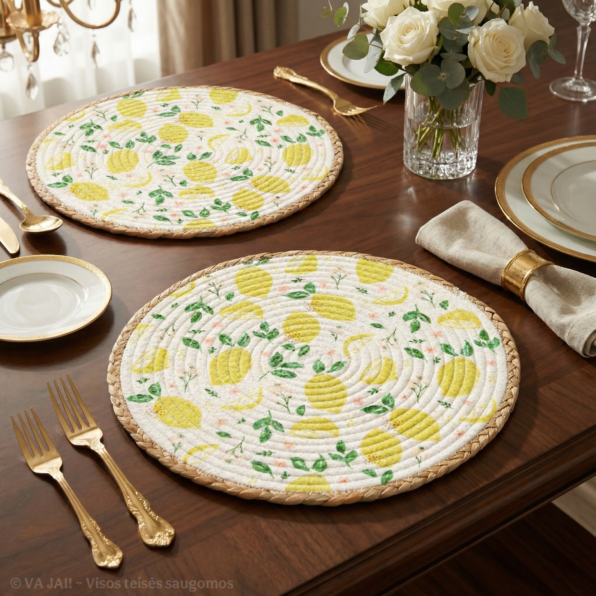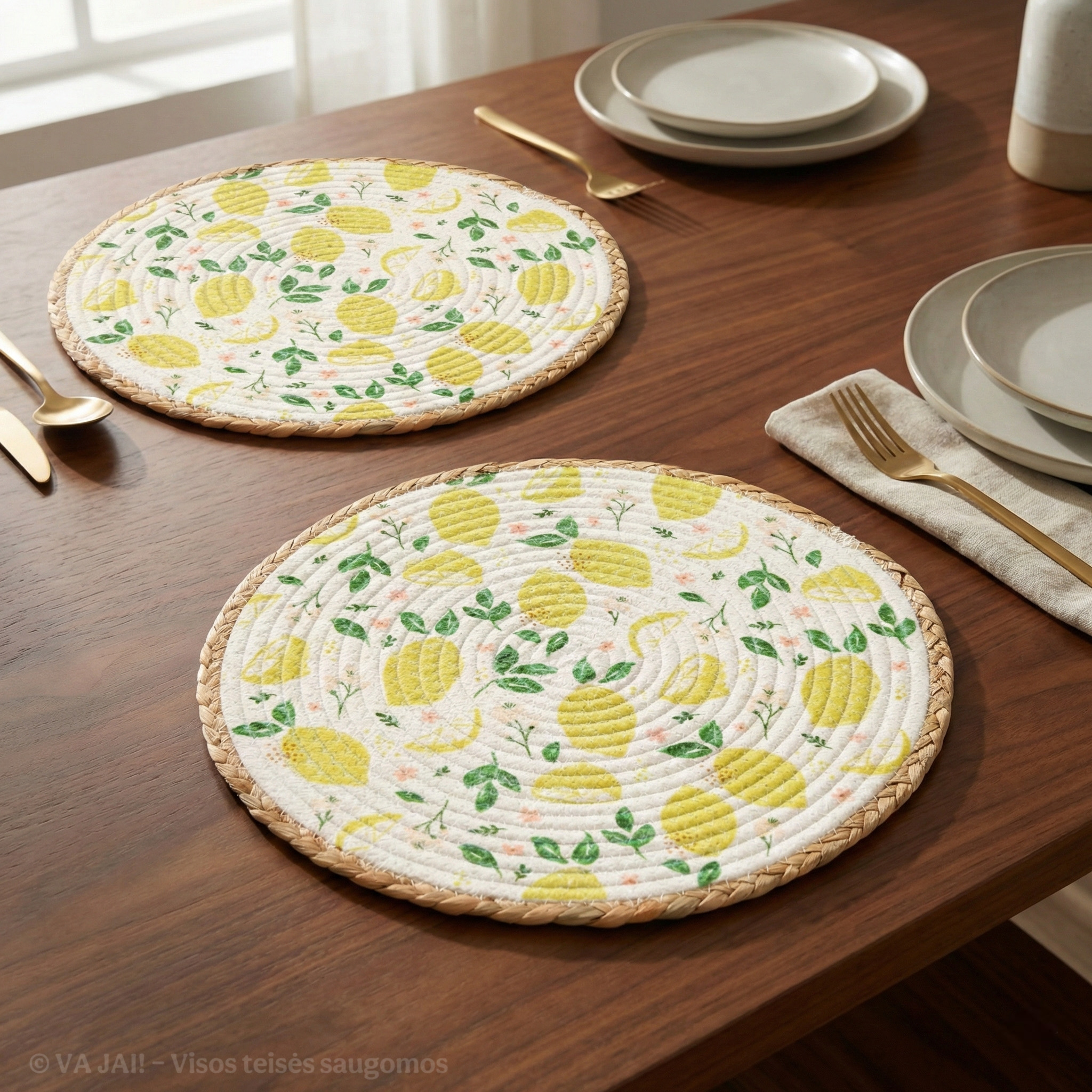Dvipusis apvalus stalo padėkliukas su citrinų dizainu ir neutralia puse – elegantiška, praktiška ir stilinga stalo detalė kasdienai bei šventėms.