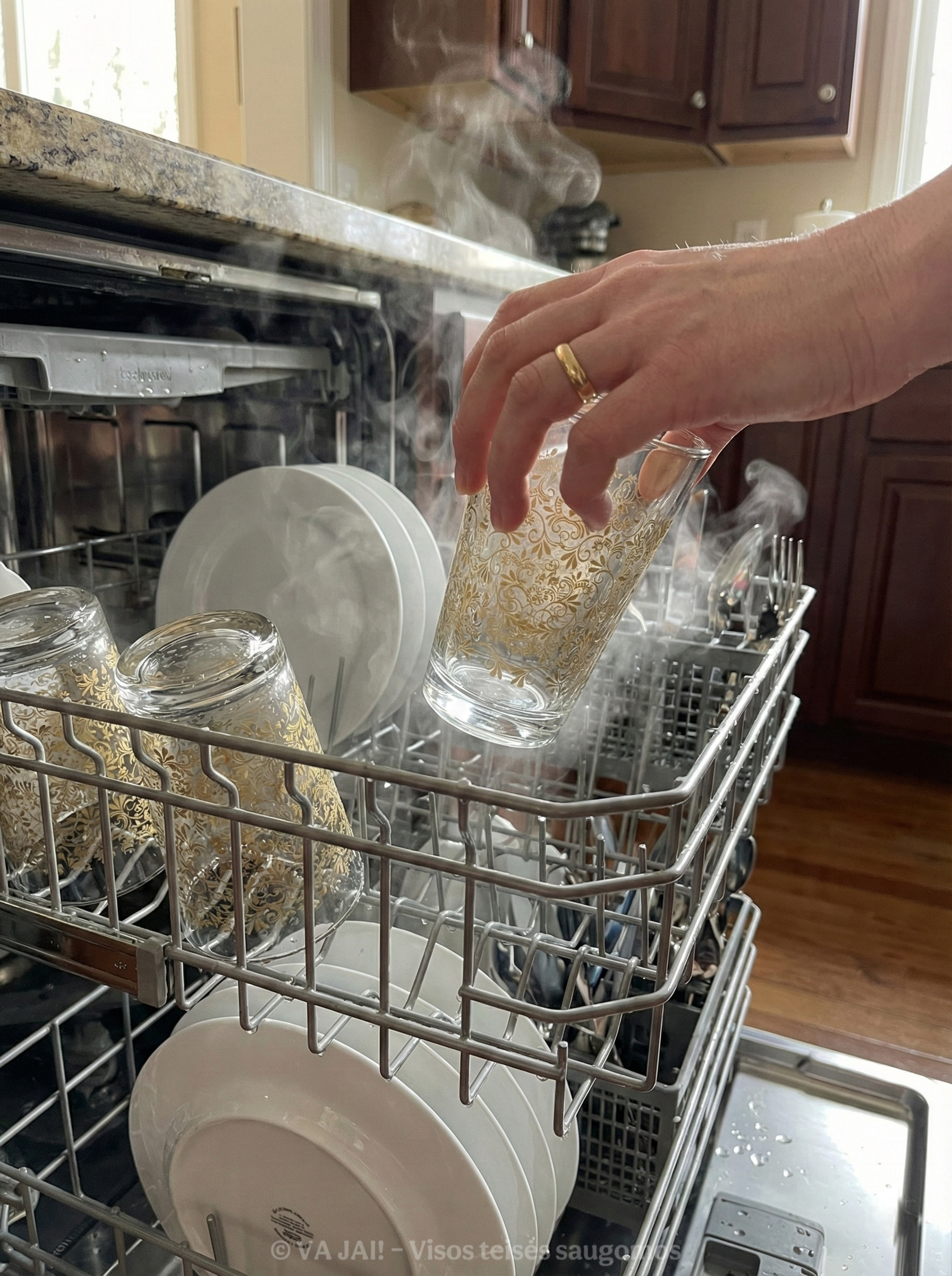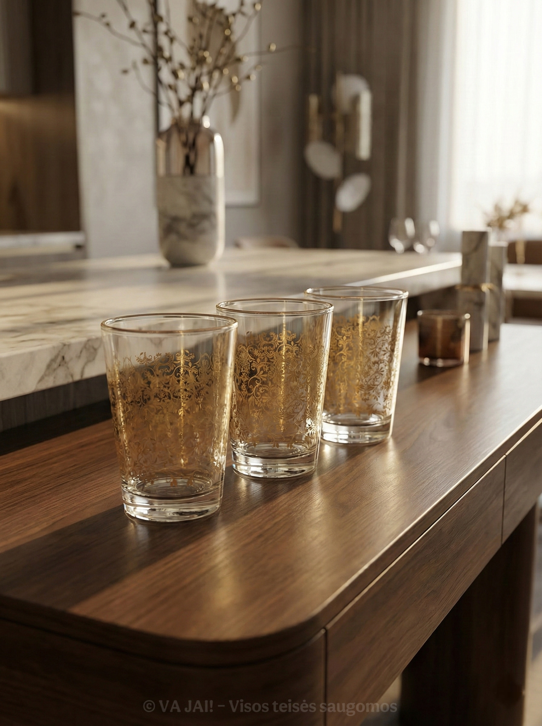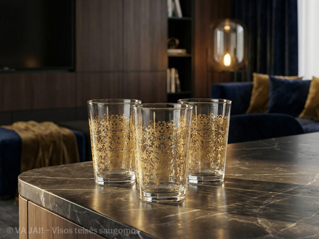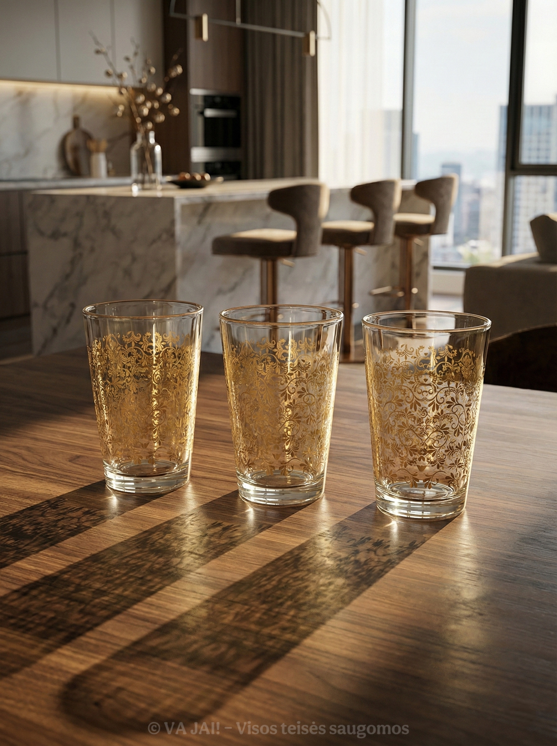 - Prabangus, aukso spalvos ornamentu dekoruotas stiklas – iš karto kuria elegantišką nuotaiką.