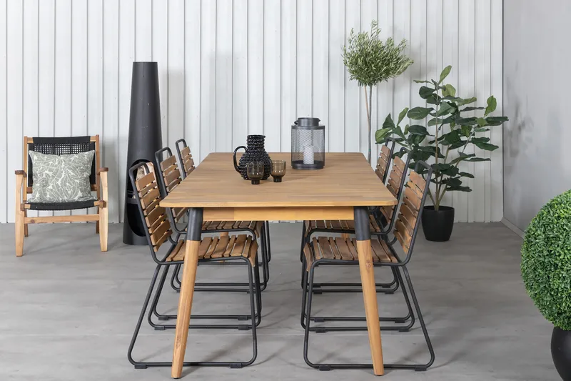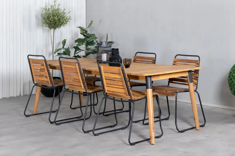 Komplektą sudaro dvi lauko kėdės, pagamintos derinant akacijos medieną ir tvirtą plieninį rėmą. Šis derinys suteikia baldams išskirtinį charakterį – natūralų, šiltą ir kartu modernų. Akacijos mediena išsiskiria savo ilgaamžiškumu ir atsparumu aplinkos poveikiui, todėl yra puikus pasirinkimas lauko baldams. Jos natūrali tekstūra ir šiltas atspalvis suteikia terasai jaukumo ir vizualinio balanso.