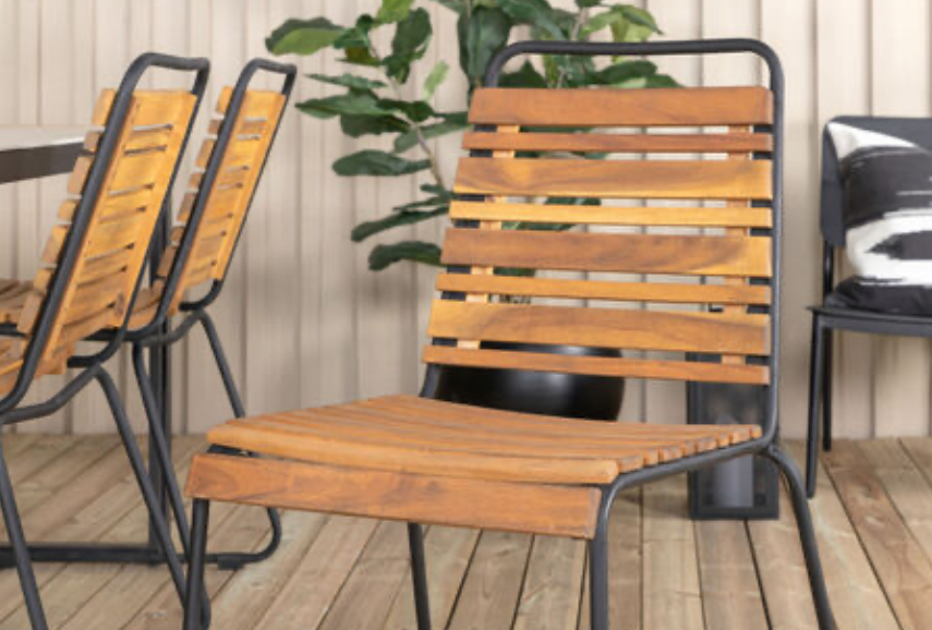 Plieninis rėmas ne tik papildo dizainą, bet ir užtikrina konstrukcijos stabilumą. Kėdės yra tvirtos, tačiau vizualiai lengvos, todėl neužgožia erdvės net ir mažesniuose balkonuose ar terasose. Juoda rėmo spalva kontrastuoja su mediena, sukurdama modernų, estetiškai subalansuotą vaizdą.