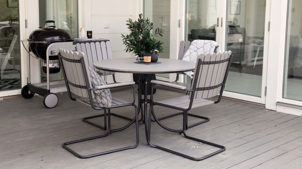 Pirmasis įspūdis – moderni ramybė ir balansas. Pilkos spalvos paviršiai subtiliai dera su juoda metaline konstrukcija, sukurdami estetiškai švarų, tvarkingą ir šiuolaikišką vaizdą. Šis komplektas puikiai tinka tiek moderniems namams, tiek skandinaviško ar minimalistinio stiliaus terasoms.