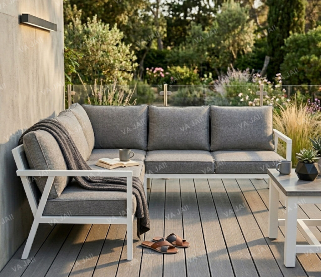 - Modernus, švarus dizainas – baltas aliuminio rėmas ir tamsiai pilkos pagalvės dera prie bet kokios terasos.