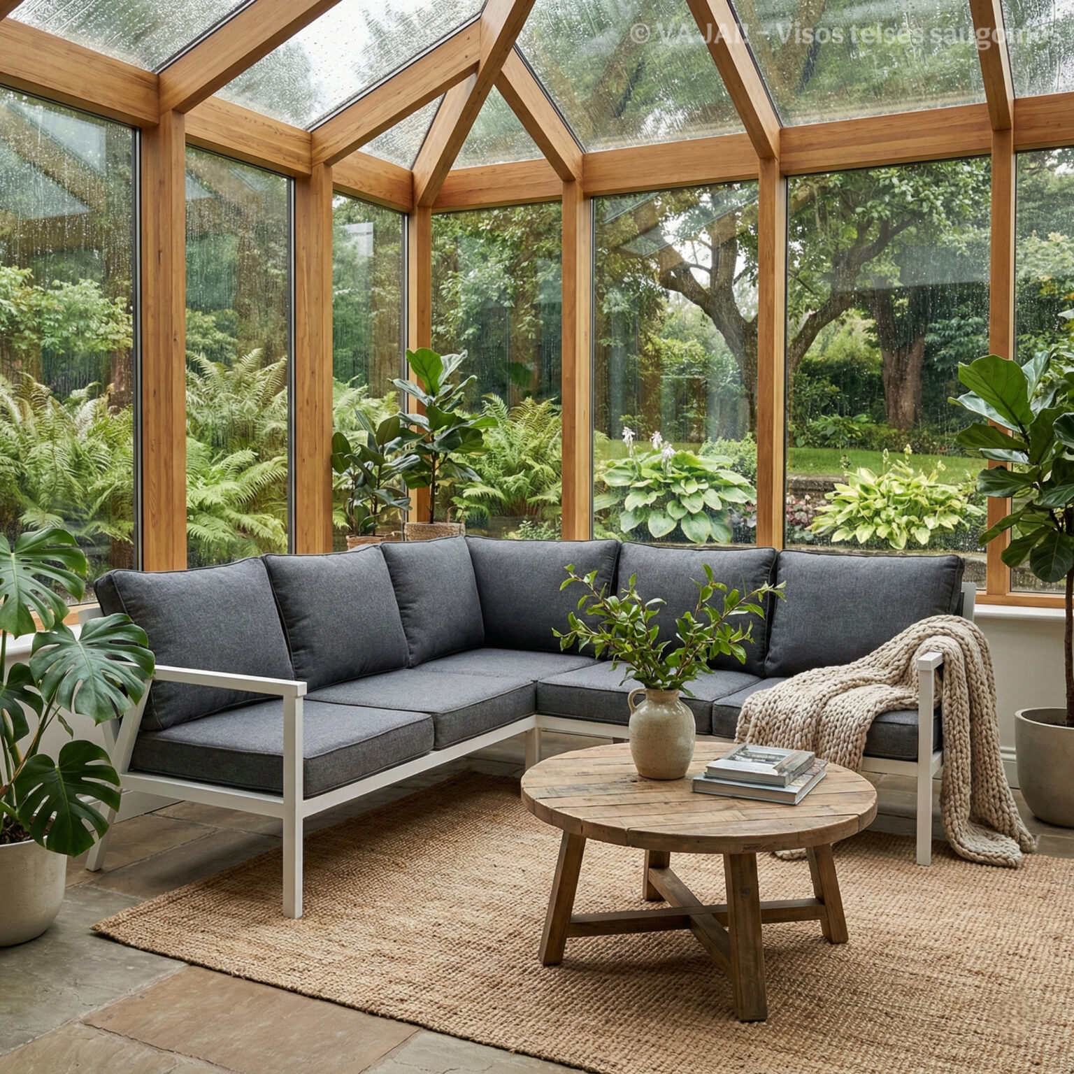 Šis terasinis kampas puikiai tinka Lietuvos klimatui – jis nebijo temperatūrų svyravimų, drėgmės ar intensyvesnės saulės. Esant poreikiui, pagalves galima laikyti po stogeliu ar apsaugoti uždangalais, taip dar labiau prailginant jų tarnavimo laiką.