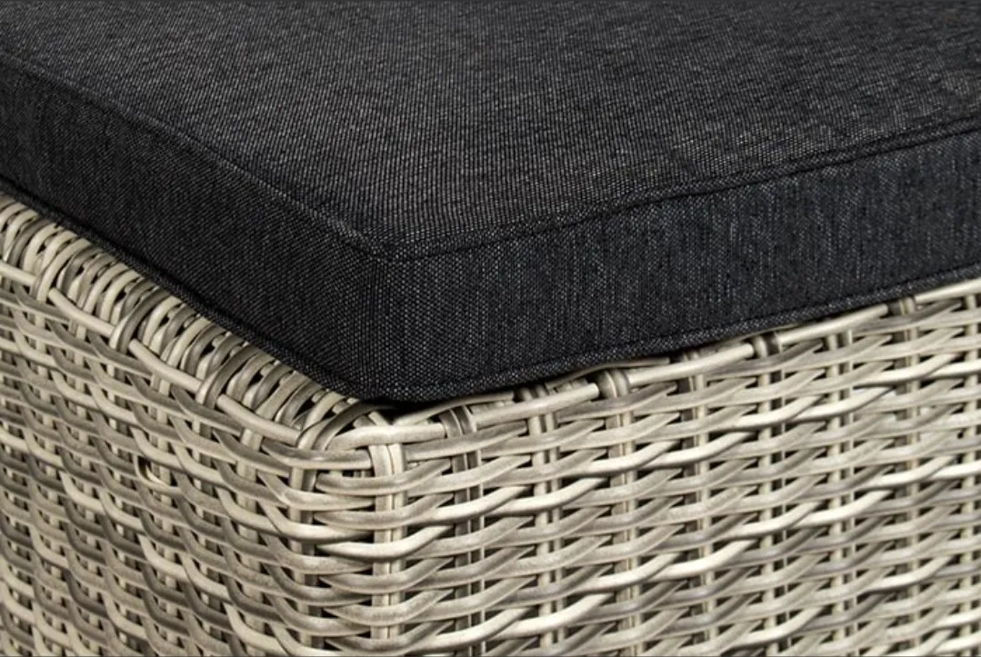Pirmas įspūdis – solidumas ir elegancija. Šviesiai pilkas sintetinio „wicker“ pynimas kartu su tamsiai pilkais paminkštinimais kuria subtilų, bet labai prabangų kontrastą. Tai spalvų derinys, kuris neperkrauna aplinkos ir lengvai įsilieja tiek į modernią terasą, tiek į klasikinį sodą ar natūralią kiemo aplinką.