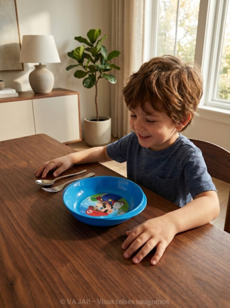 Ryški mėlyna spalva kartu su spalvingu Mario atvaizdu sukuria žaismingą, pozityvią nuotaiką. Vaikams svarbus vizualinis patrauklumas – jie noriau sėda prie stalo, kai indai atrodo linksmi ir pažįstami. Toks dubenėlis dažnai tampa „mėgstamiausiu“, iš kurio vaikas nori valgyti net ir tuos patiekalus, kurių anksčiau vengė.