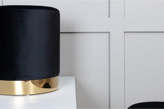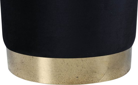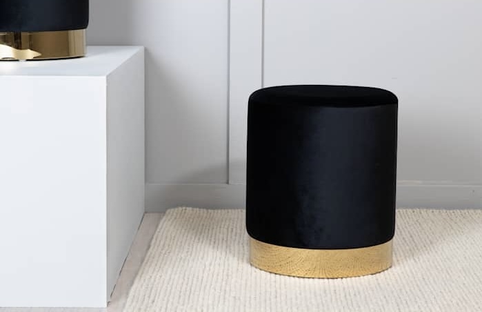 Apatinė dalis dekoruota auksinės spalvos metaliniu pagrindu. Ši detalė suteikia modernumo ir elegancijos, o kartu vizualiai „pakelia“ pufą nuo grindų, suteikdama lengvumo pojūtį. Kontrastas tarp juodo veliūro ir šilto metalo atspalvio atrodo itin harmoningai ir stilingai. Tai detalė, kuri dažnai tampa tuo „wow“ akcentu, kurį pastebi svečiai.