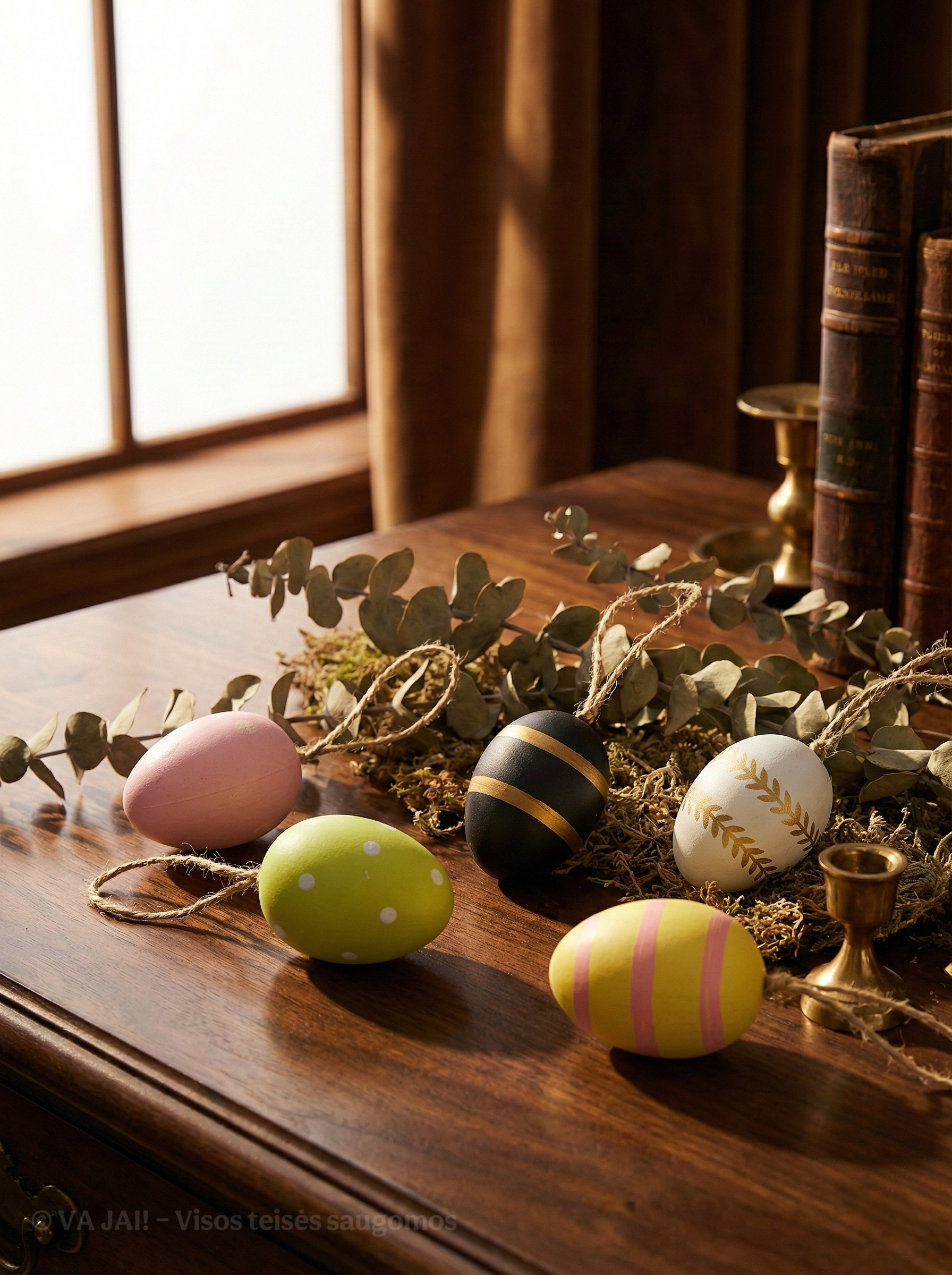 Pakabinimui naudojamos natūralios džiuto virvelės – jos suteikia dekoracijoms jaukumo ir natūralumo pojūtį. Džiutas puikiai dera su medžio šakomis, pavasarinėmis kompozicijomis ar minimalistiniu interjeru. Velykų margučius galima kabinti ant dekoratyvinių šakų vazose, ant Velykų medelio, langų rankenų ar net integruoti į stalo kompozicijas.