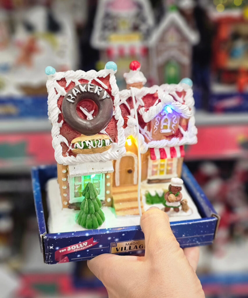 Vos pažvelgus į šį miestelį, akys iškart pagauna šilto LED apšvietimo spindesį, sklindantį iš mažų langelių. Lyg kažkas viduje keptų imbierinius sausainius ir lauktų Kalėdų stebuklo. Ant fasado puikuojasi užrašas „Bakery“, išraižytas baltu glajumi ant raudonos lentelės – tai akcentas, kuris traukia žvilgsnį ir iškart sukuria pasakos nuotaiką.