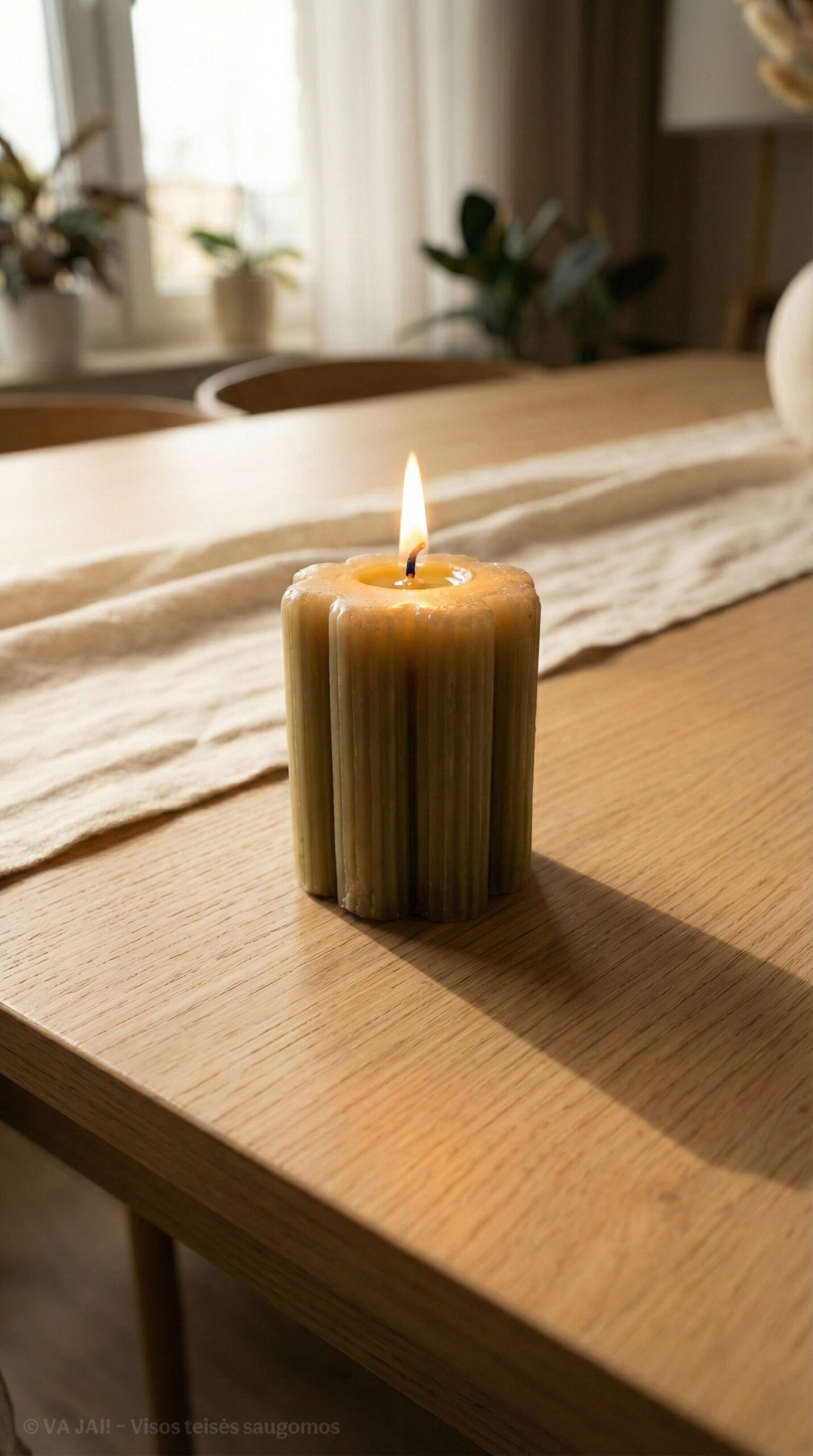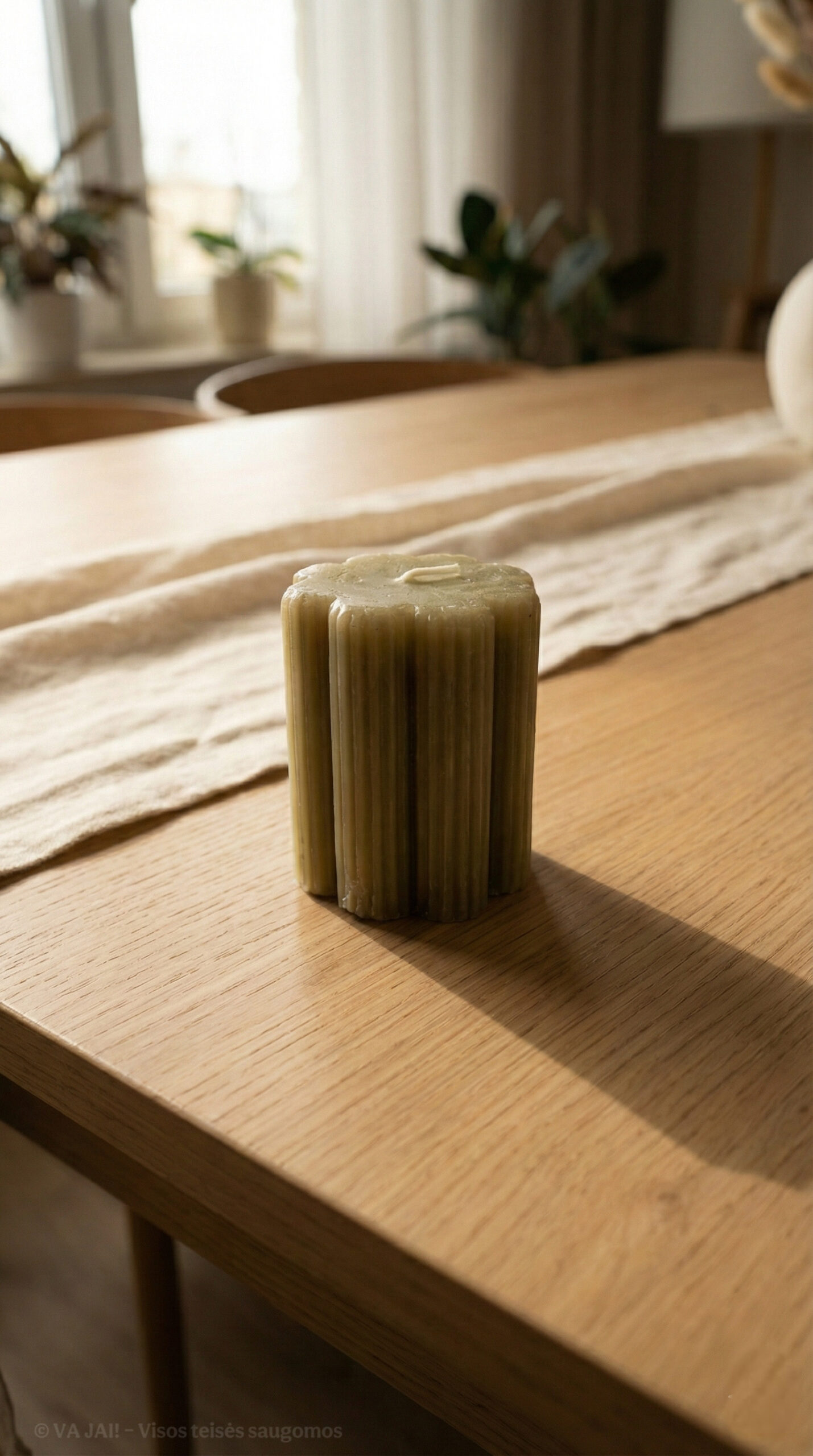 - Unikalus reljefinis dizainas – vertikalios linijos ir subtiliai formuotas viršus suteikia žvakei išskirtinumo.