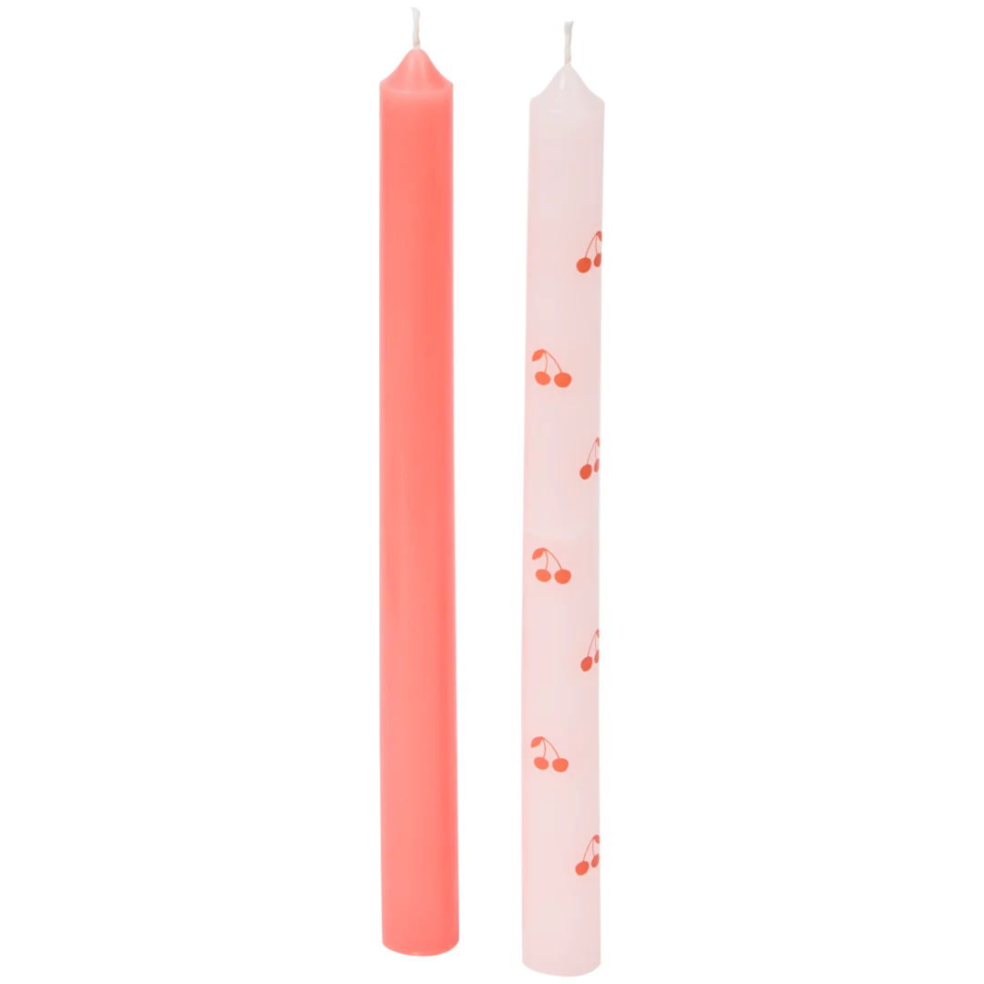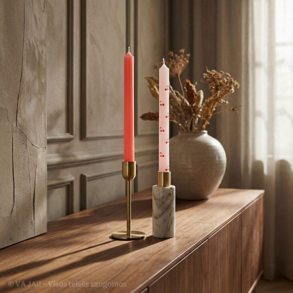 Šis dviejų žvakių komplektas išsiskiria savo spalvine harmonija. Viena žvakė – sodresnės, šiltos koralinės spalvos, kita – švelniai rožinė, dekoruota minimalistiniu vyšnių motyvu. Toks derinys atrodo moderniai, bet kartu išlaiko klasikinį žvakių charakterį. Žvakės puikiai tinka tiek šiuolaikiškam, tiek skandinaviškam ar romantiškam interjerui.